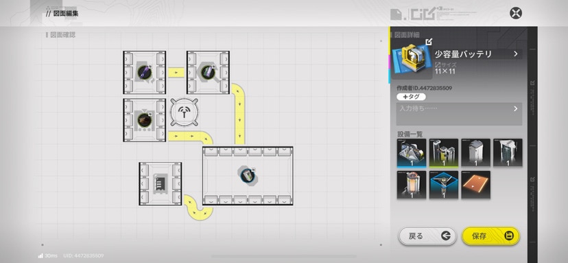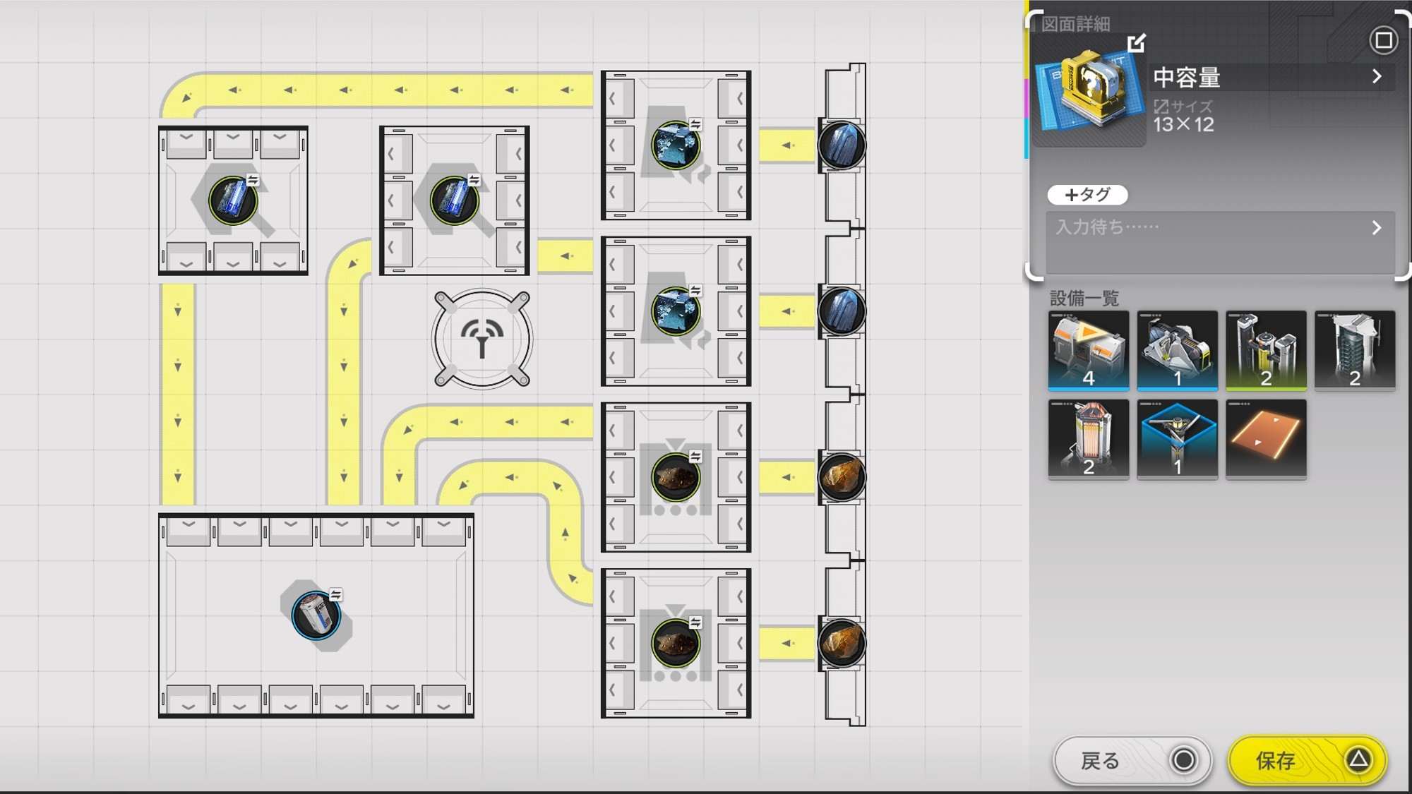 掲載図面は省スペースを意識していますが、スペースに余裕があるなら源石鉱物を1ライン追加しましょう。1ライン追加することで、作成スピードと共有スピードが同じになるのでより効率的に中容量谷地バッテリーを作成できます。