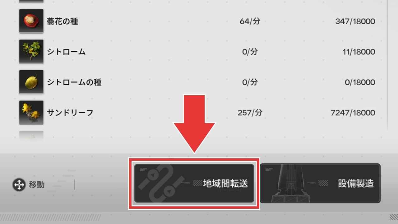地域間転送は、自動で他の地域にアイテムを転送できる機能です。地域間は倉庫が共有されていないため、他の地域にアイテムを移す時は地域間転送を使うか、道具箱にアイテムを入れて手動でアイテムを運ぶ必要があります。