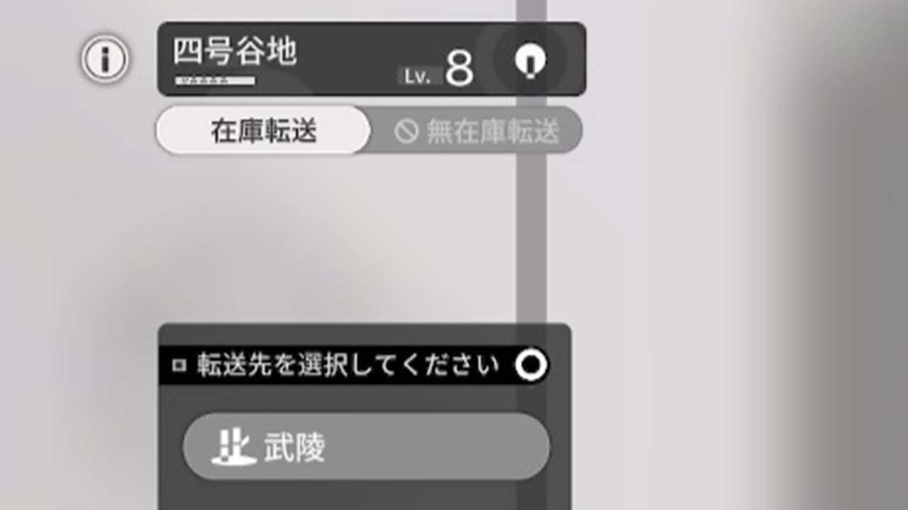 地域間転送の解放には、転送元地域の地域建設レベルも必要です。四号谷地の場合は地域建設レベル8で在庫転送が解放、地域建設レベル12で無在庫転送が解放されます。
