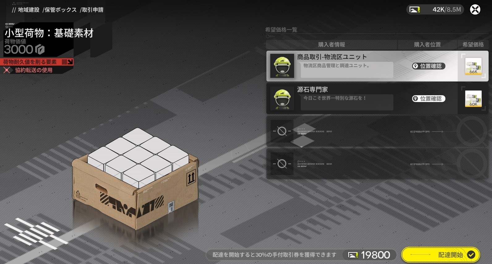 保管ボックスの配達任務は1か所につき1日1回しか受けられません。四号谷地では1日最大3件まで受注可能なので、谷地取引券を稼ぐのチャンスを逃さないようにしましょう。