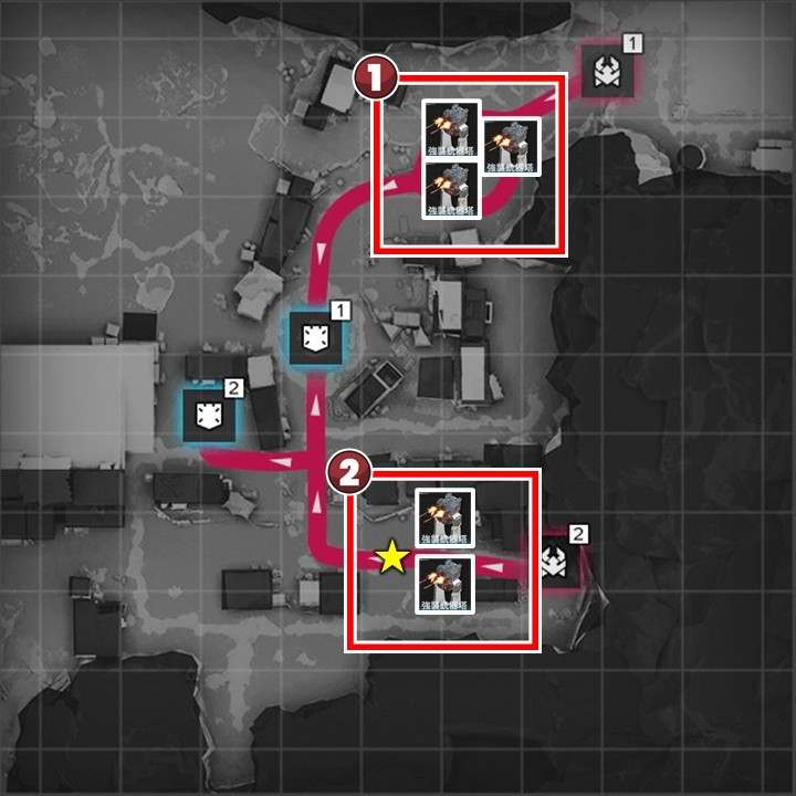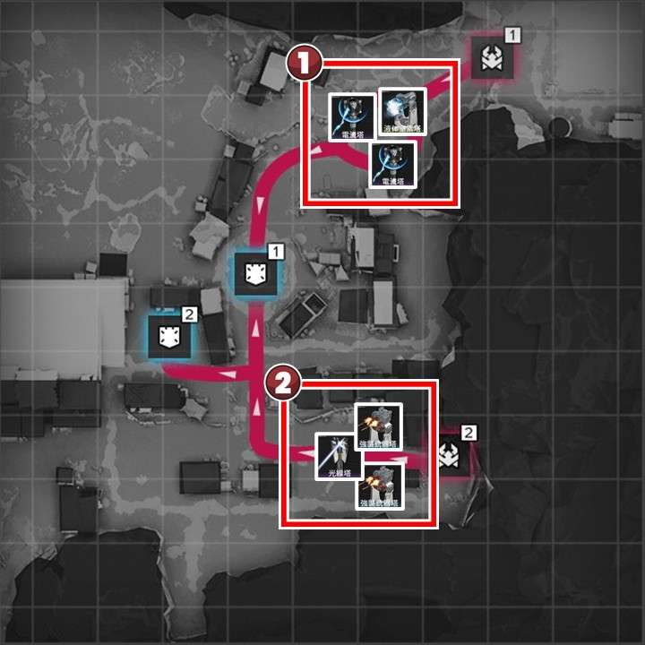 拠点防衛時は、各侵入ルートに減速設備1台と火力設備複数台設置がおすすめです。序盤は「液体窒素塔」で敵を減速させつつ「強襲銃器塔」で敵を倒しましょう。