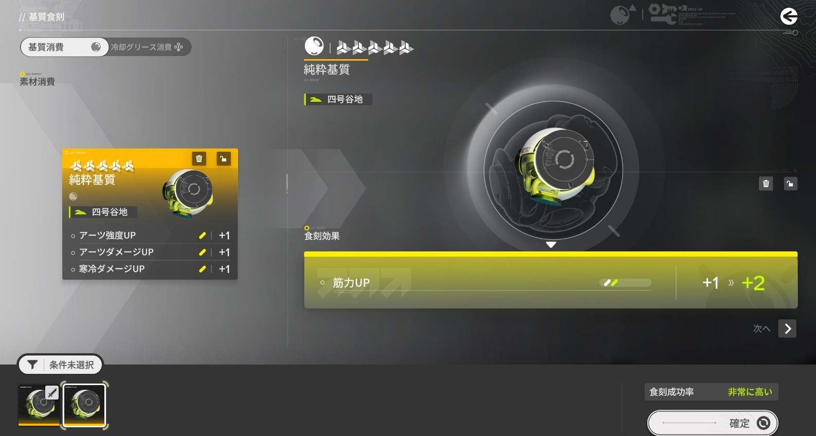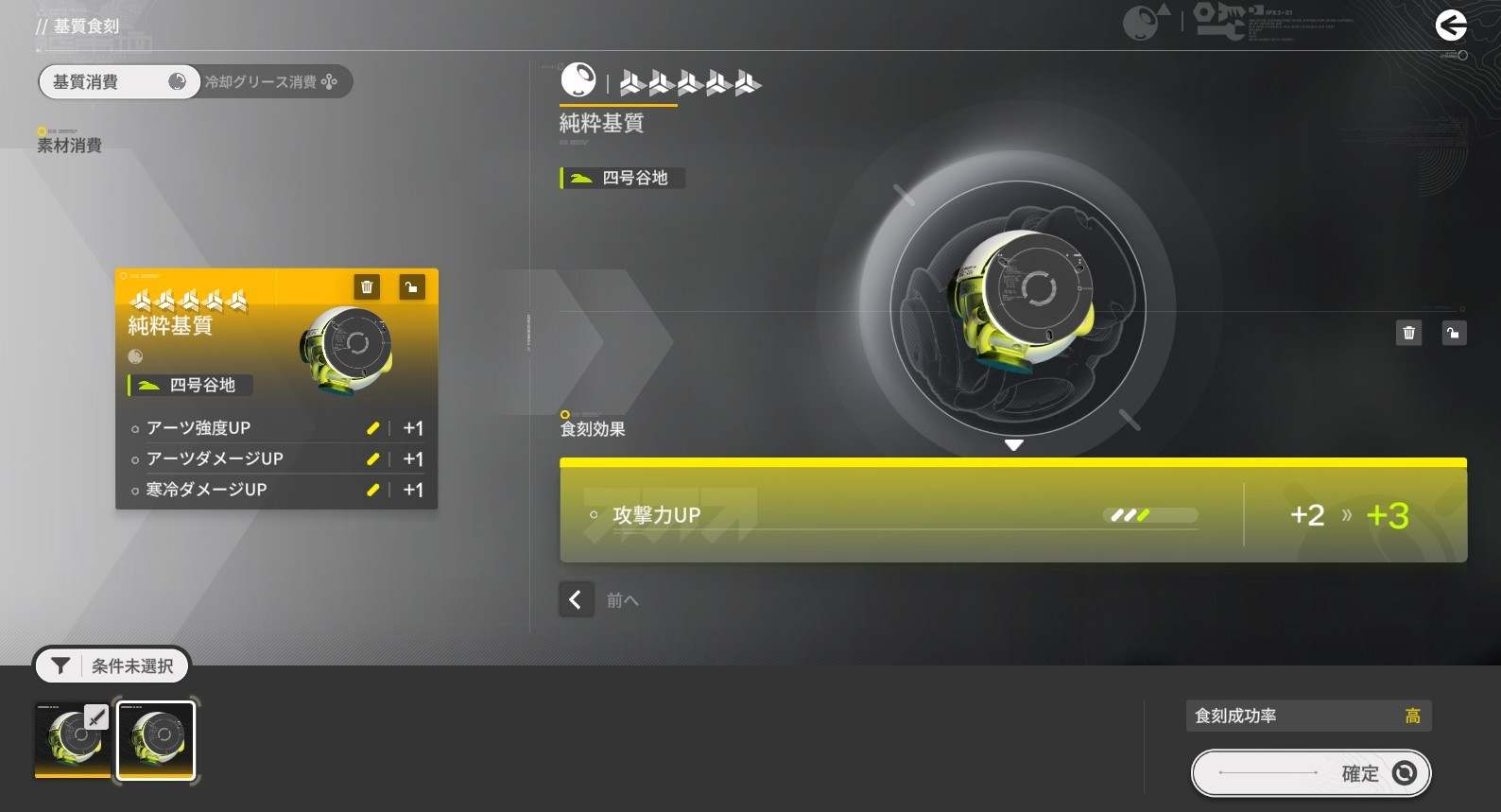 基質のレベルアップに失敗すると、使用した基質が消える代わりに冷却グリースを獲得します。冷却グリースは確定で基質食刻を成功させるアイテムですが、レベルが上がるごとに必要量が増えていきます。
