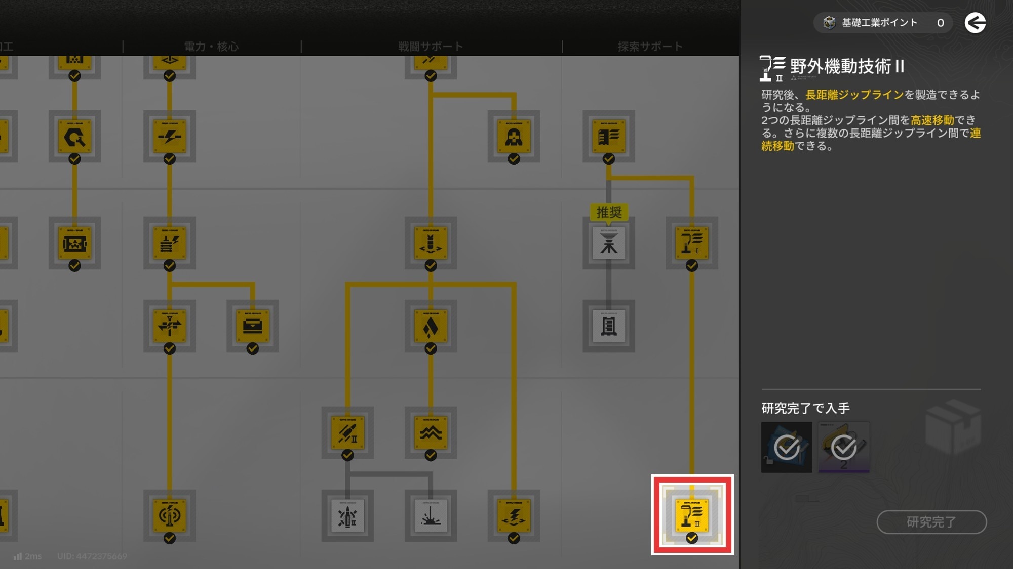 探索時の移動をスムーズしたい場合は、野外機動技術IIの優先度が上がります。野外機動技術IIを解放すると最大110mまで接続できる長距離ジップラインを製造でき、長距離ジップライン使用時は高速で移動可能です。