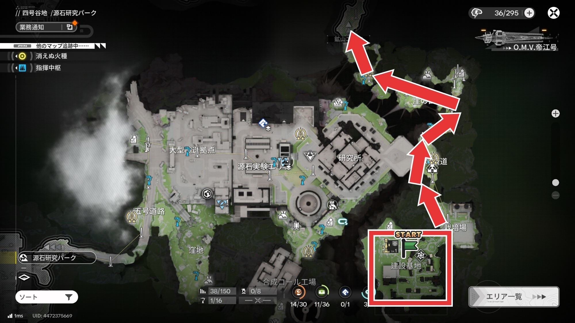 鉱山エリアは、エネルギー高地からも電力輸送できます。ただし、エネルギー高地からの電力輸送はストーリーを第一章 プロセスIVの進行と解放までに時間がかかるため、早々に電力を繋げたい場合は源石研究パークからの電力輸送がおすすめです。