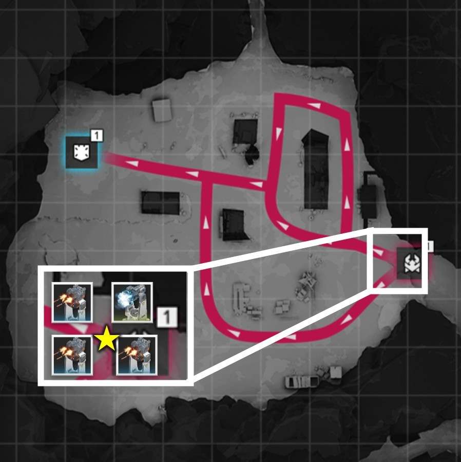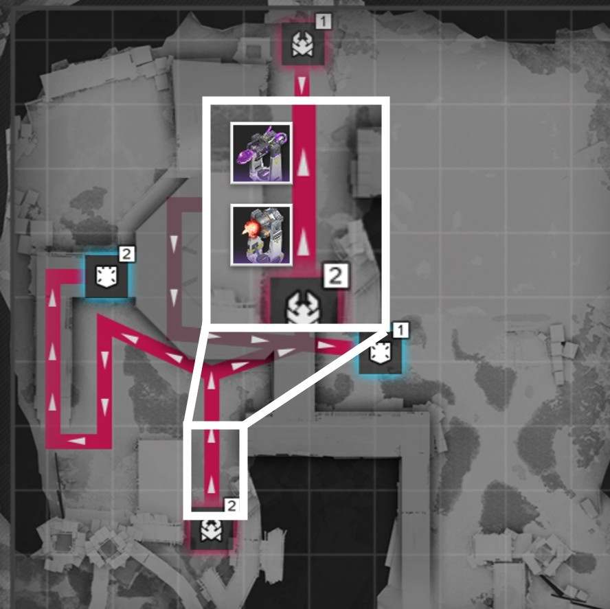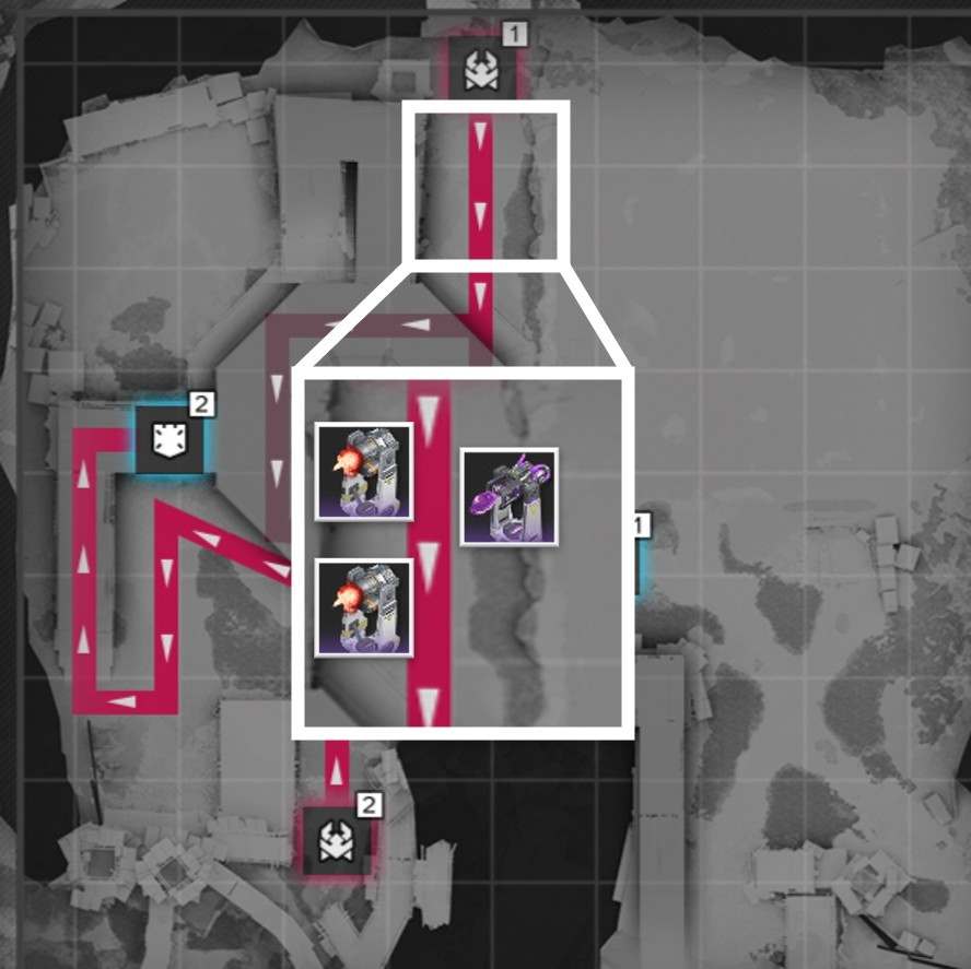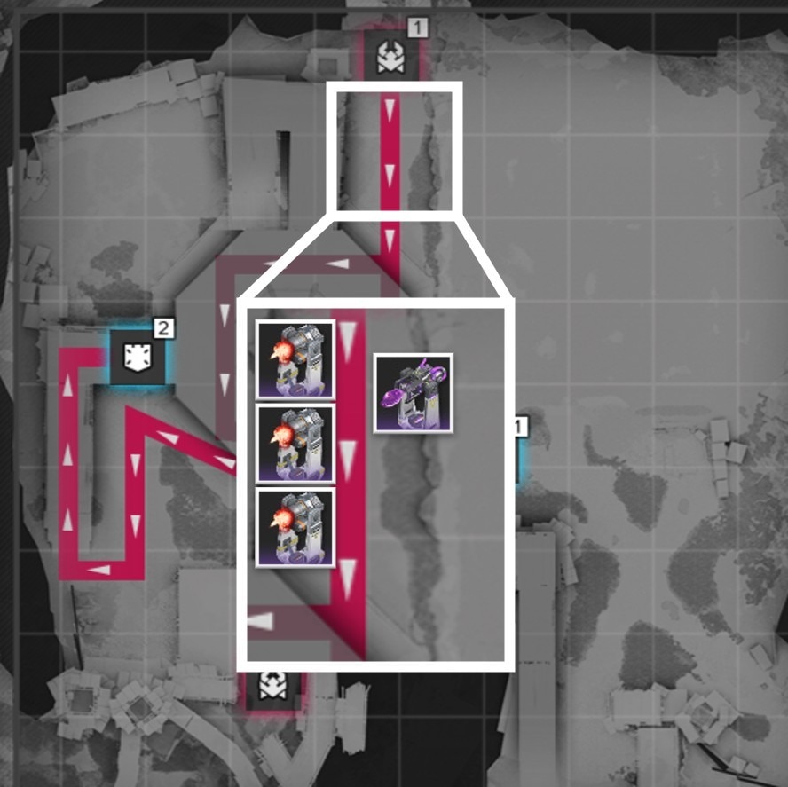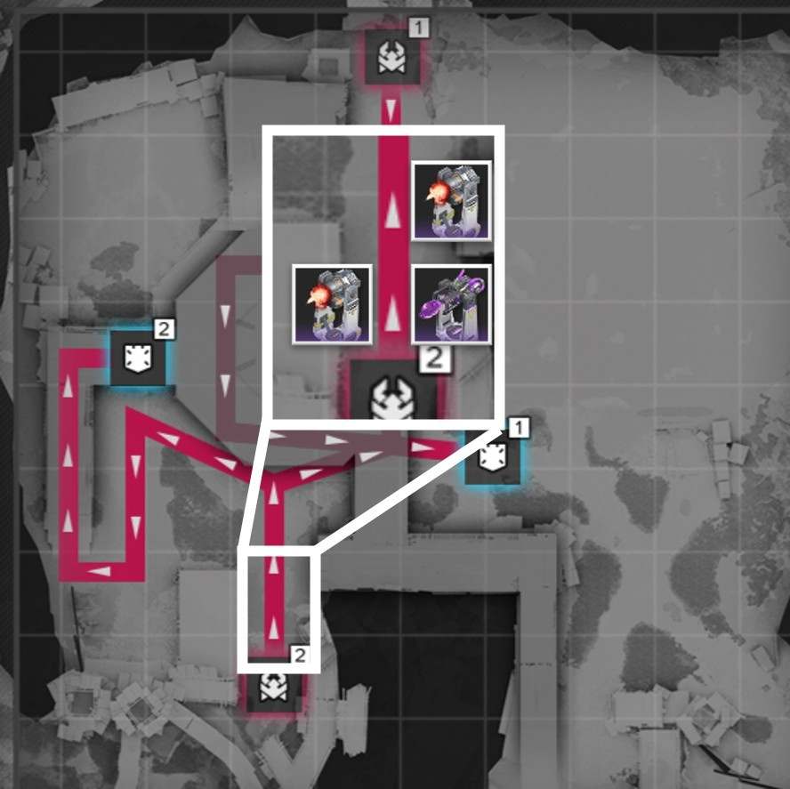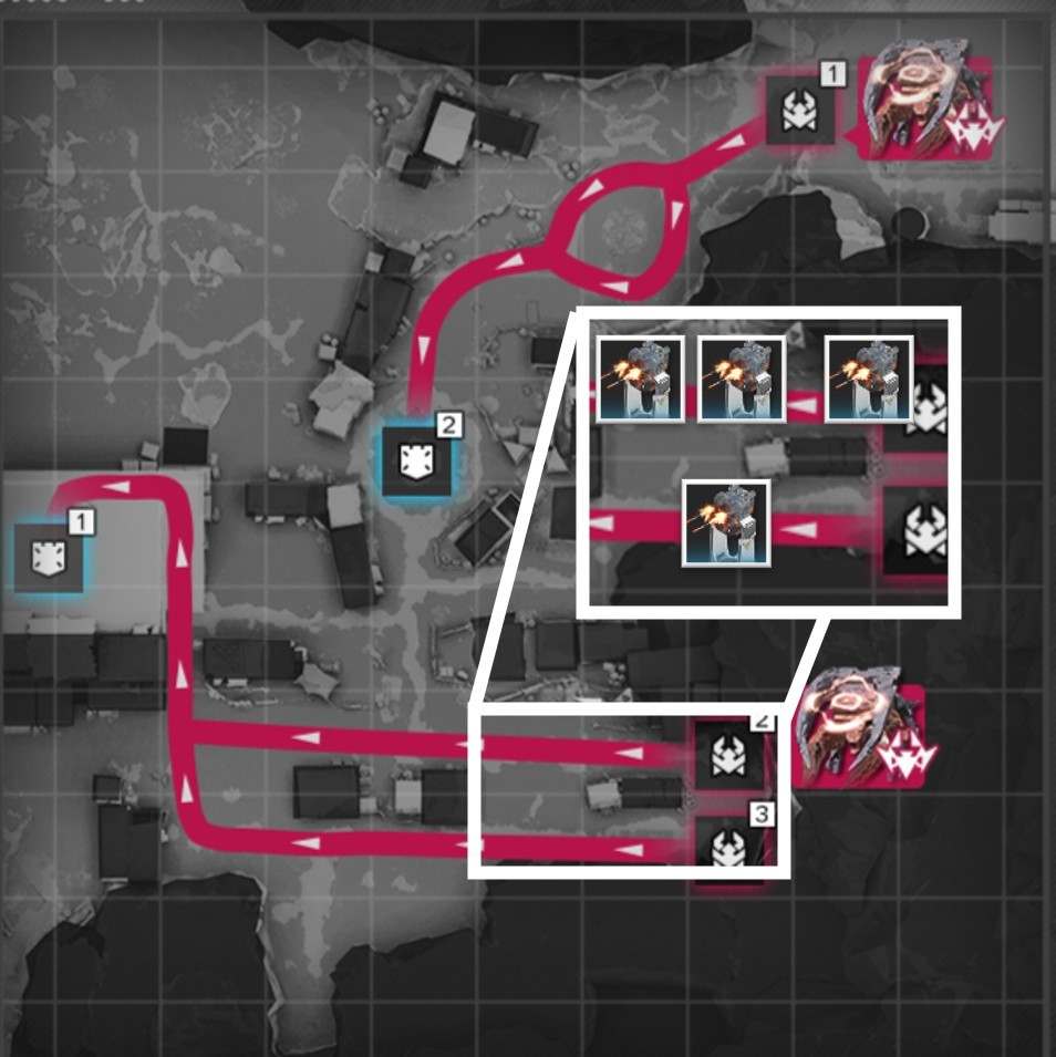拠点防衛時は、侵入ルート付近で撃破を狙いましょう。複数侵入ルートがある場合、合流地点を狙う方が簡単に見えますが、一部の敵は周囲の敵にバフを付与するスキルを使用するため、合流されると倒し切れない恐れがあります。
