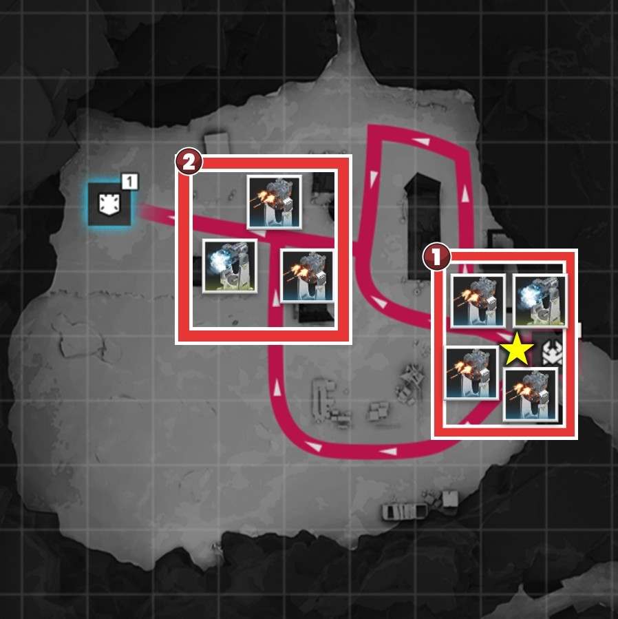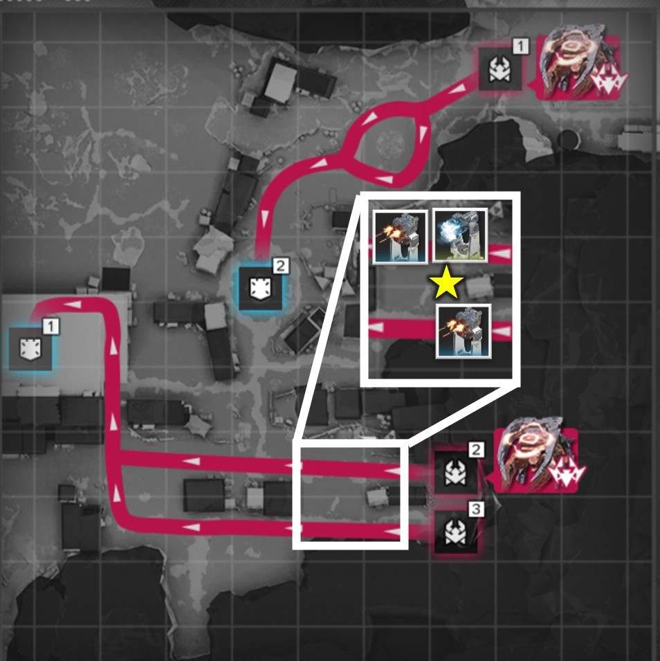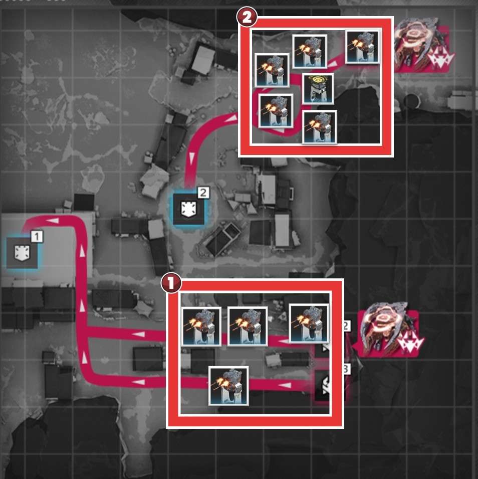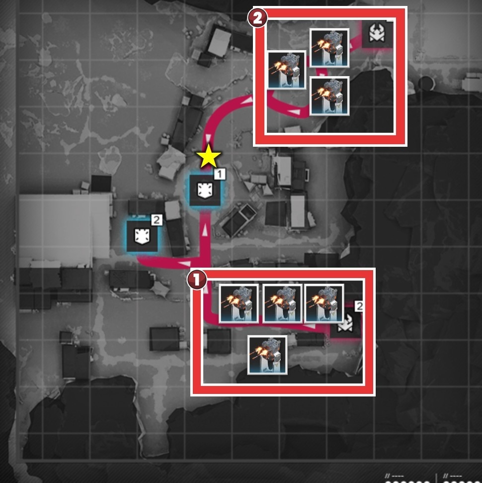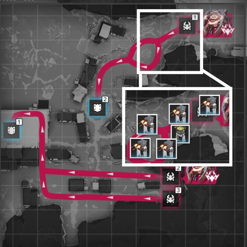 拠点防衛時は、侵入ルート付近で撃破を狙いましょう。複数侵入ルートがある場合、合流地点を狙う方が簡単に見えますが、一部の敵は周囲の敵にバフを付与するスキルを使用するため、合流されると倒し切れない恐れがあります。
