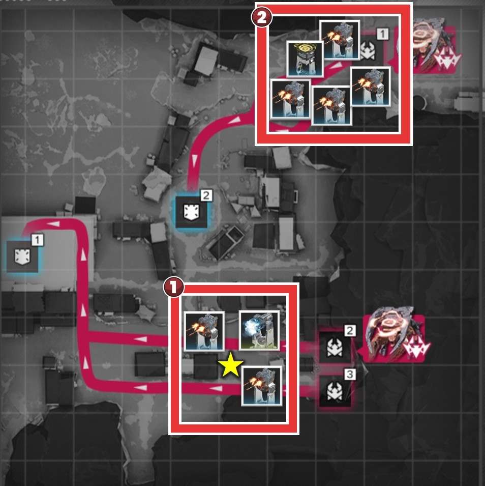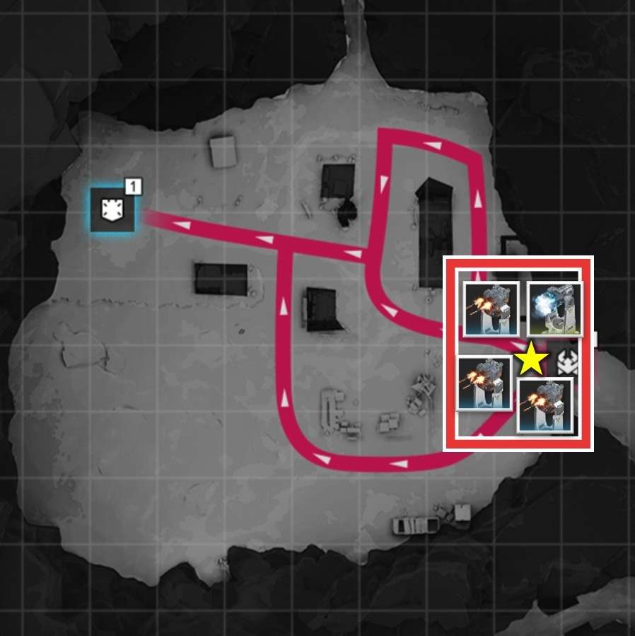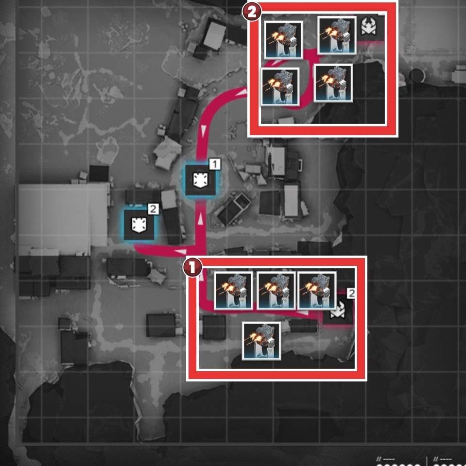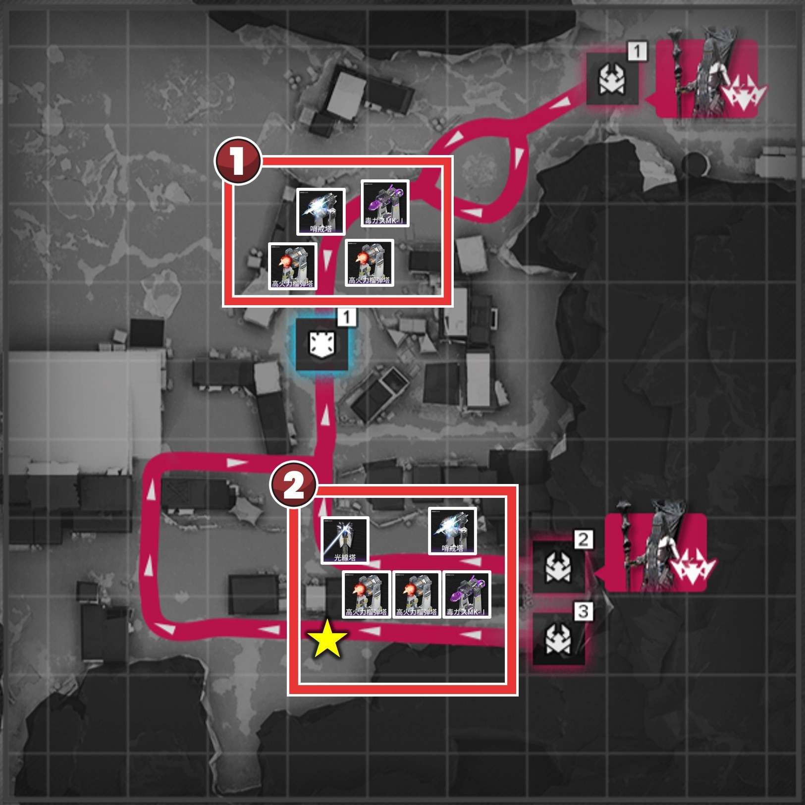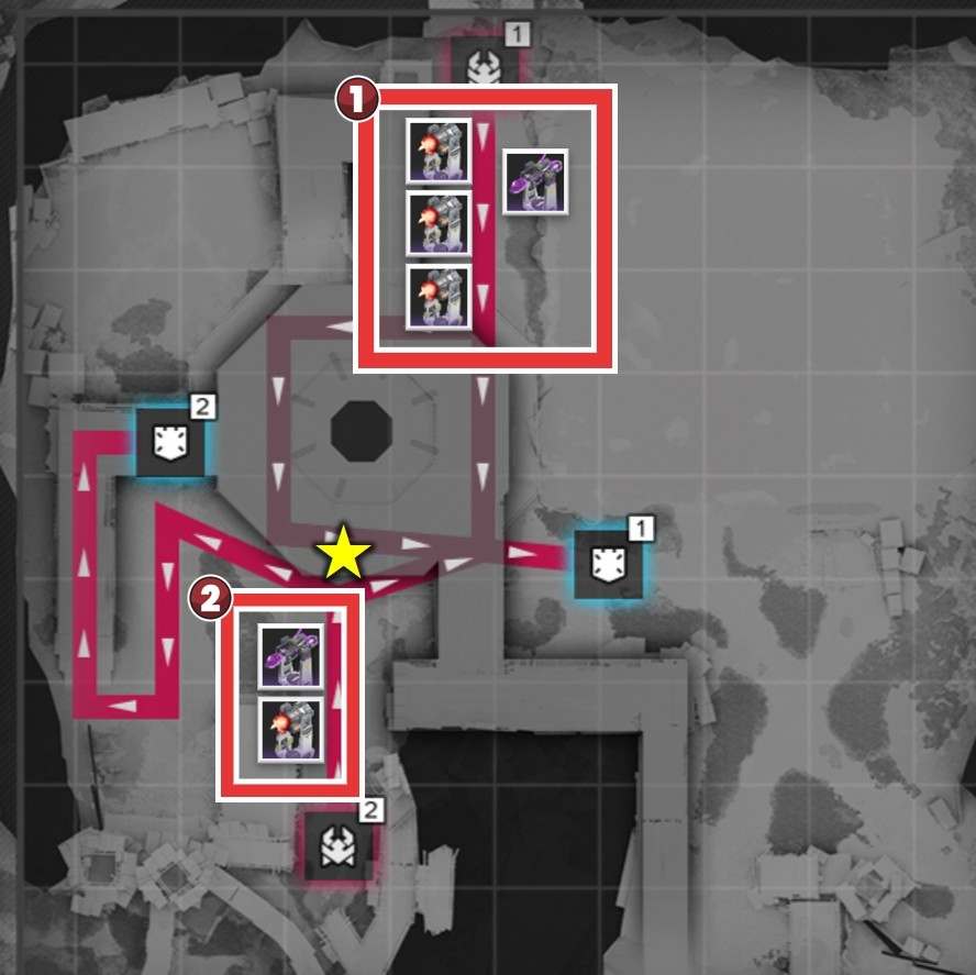 拠点防衛時は、侵入ルート付近で撃破を狙いましょう。複数侵入ルートがある場合、合流地点を狙う方が簡単に見えますが、一部の敵は周囲の敵にバフを付与するスキルを使用するため、合流されると倒し切れない恐れがあります。