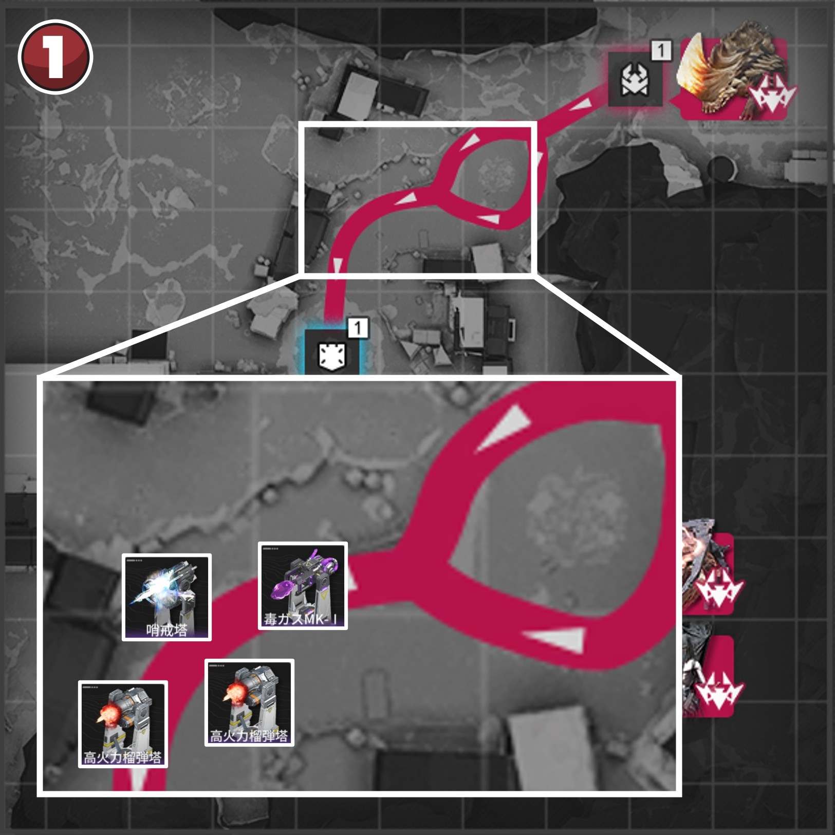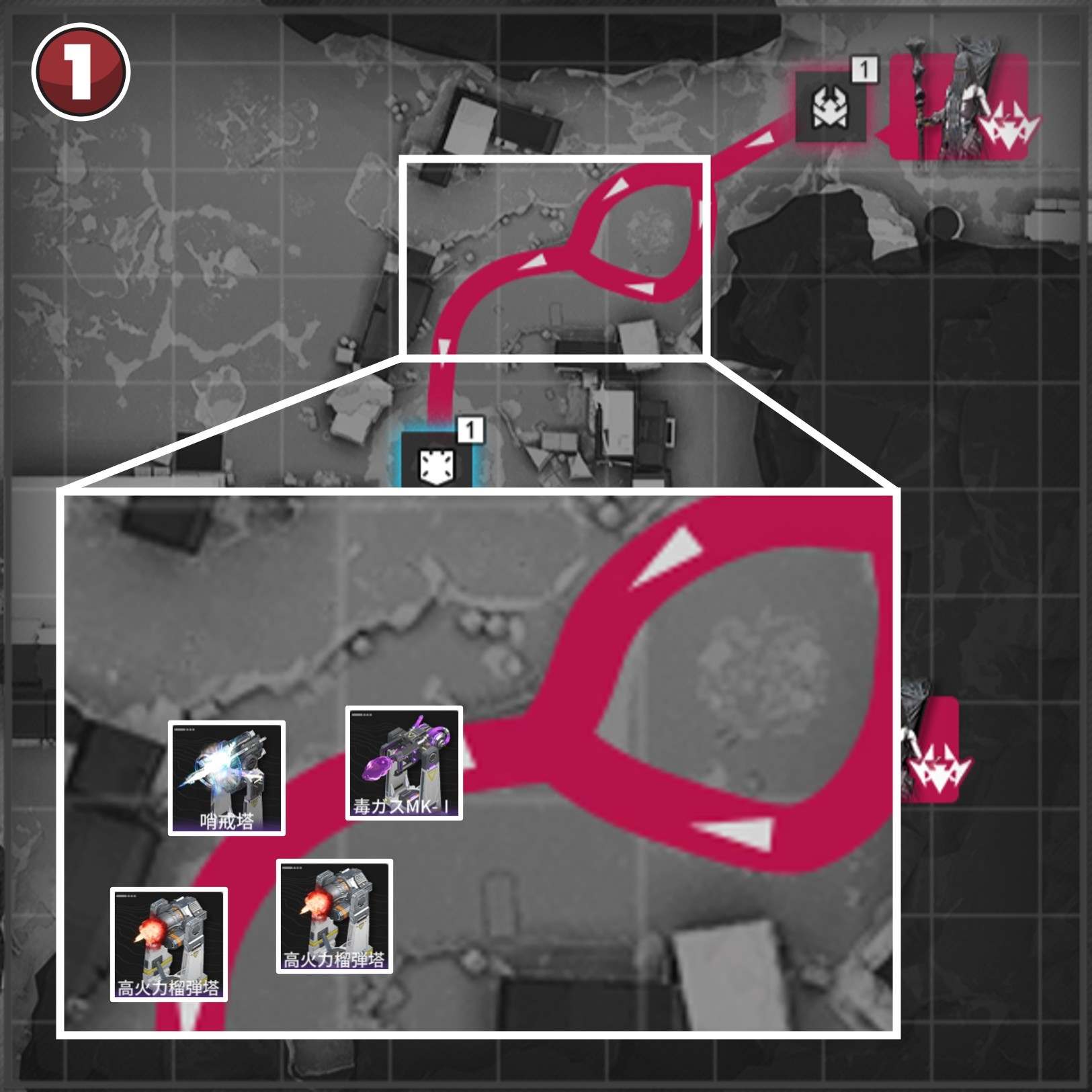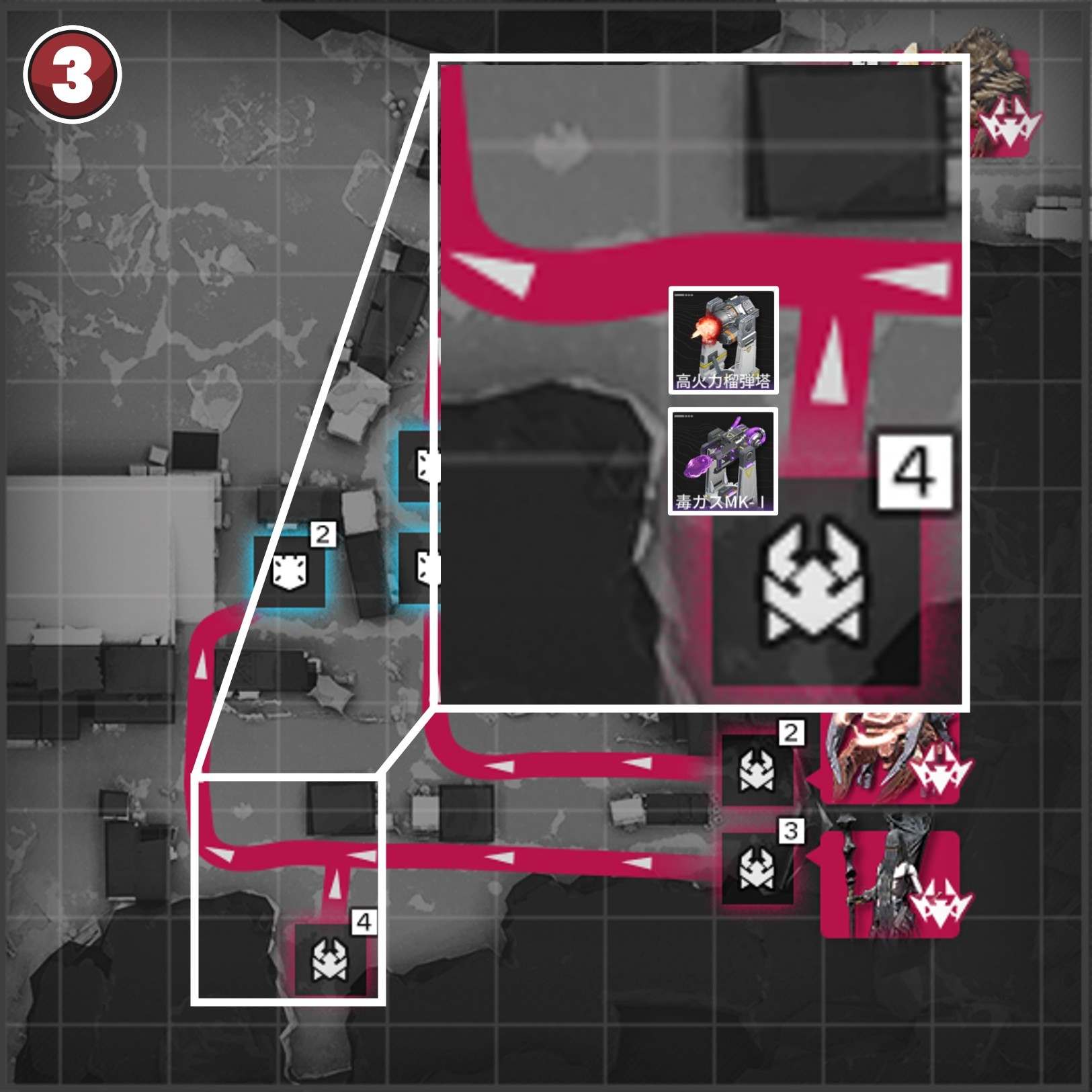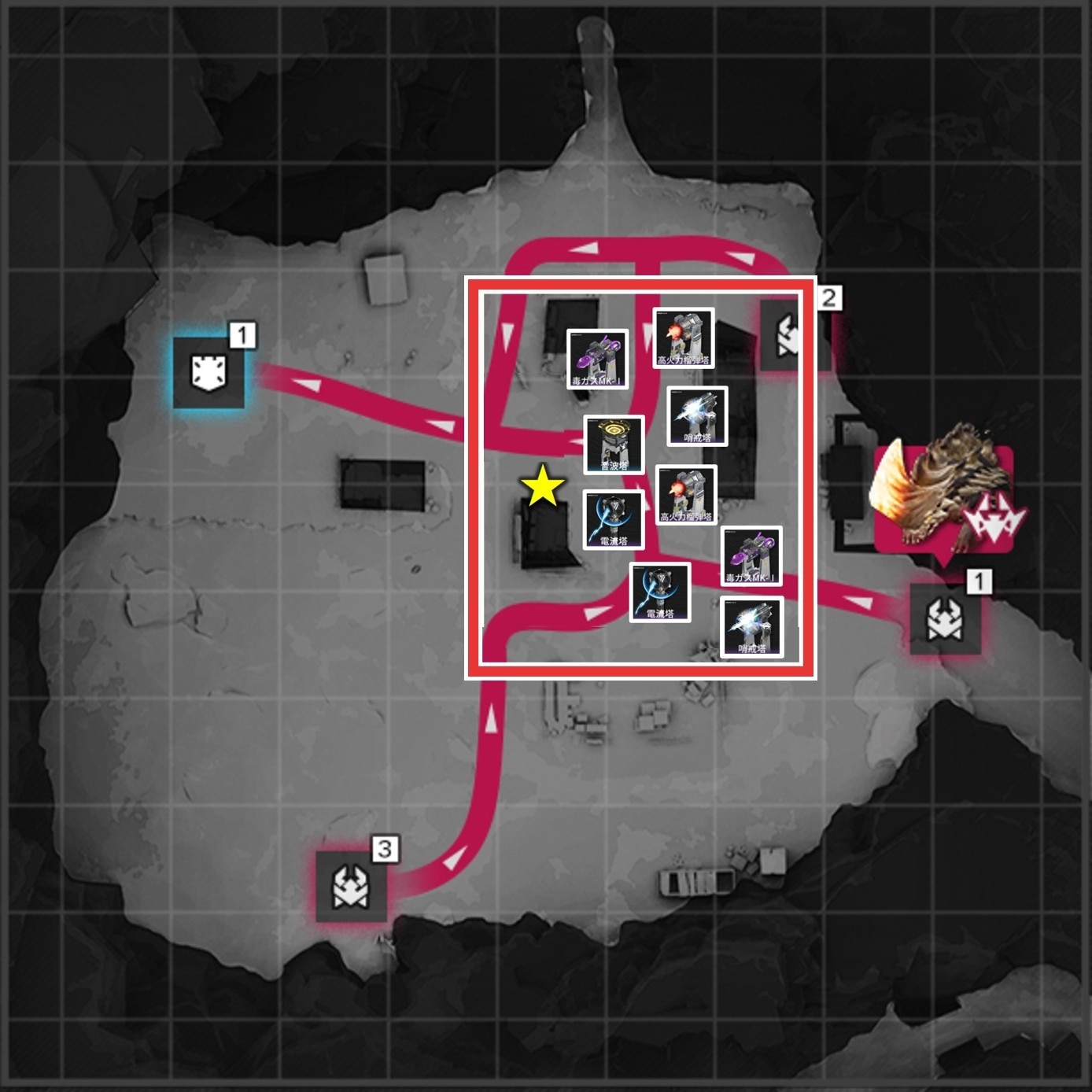 拠点防衛時は、侵入ルート付近で撃破を狙いましょう。複数侵入ルートがある場合、合流地点を狙う方が簡単に見えますが、一部の敵は周囲の敵にバフを付与するスキルを使用するため、合流されると倒し切れない恐れがあります。