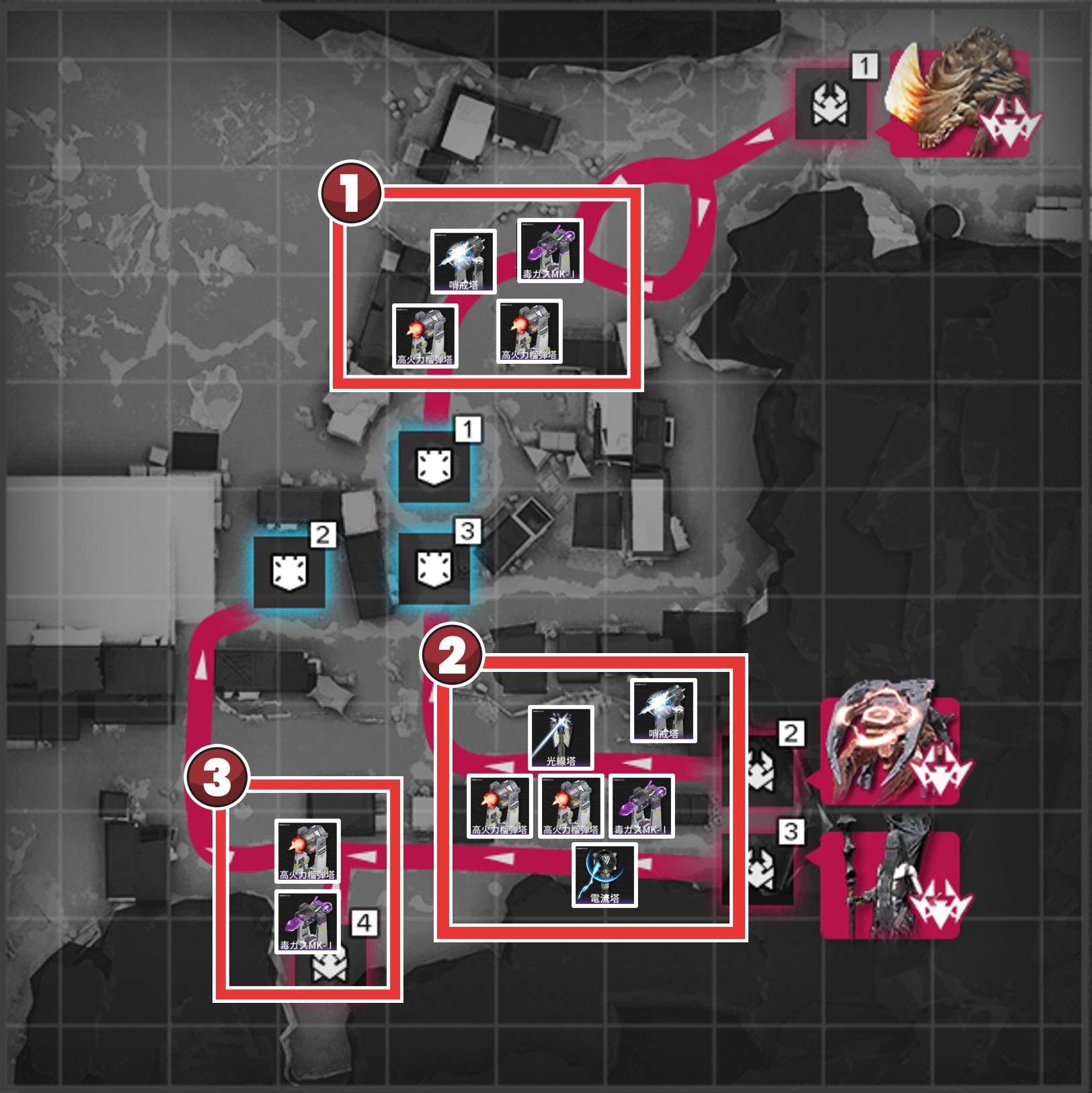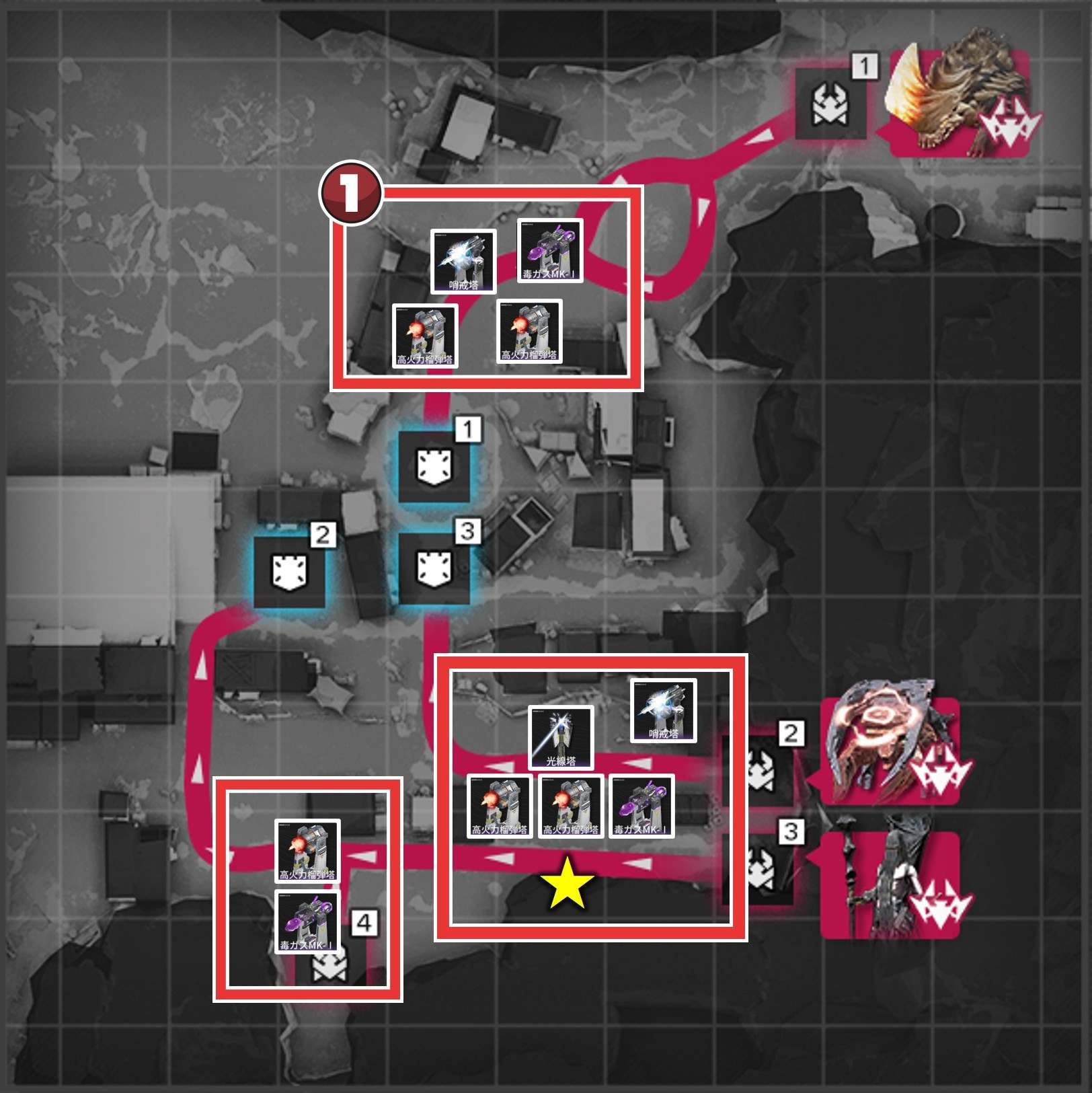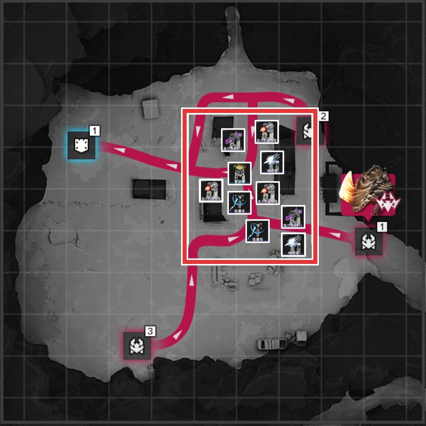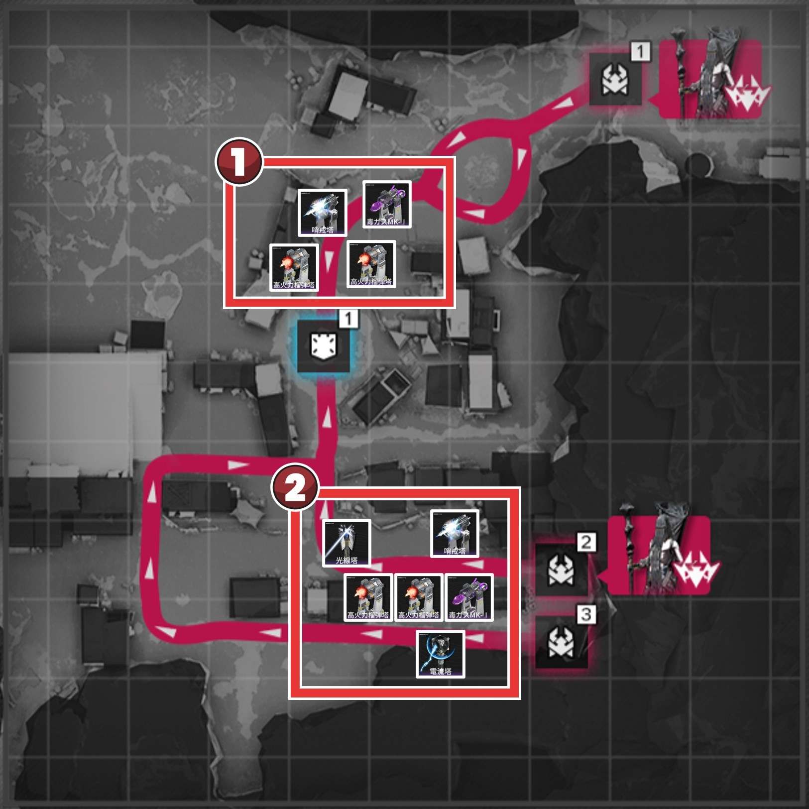 後半は「毒ガスMK-I」で敵を減速させつつダメージを与え、「高火力榴弾塔」や「電流塔」で敵を一掃しましょう。減速中に大ダメージを与えられるため、合流前に敵を倒せます。
