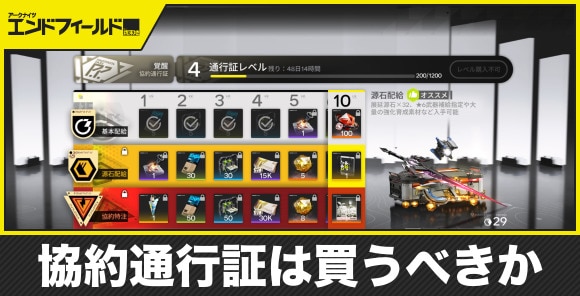 アークナイツエンドフィールドの協約通行証は買うべきかについてご紹介。源石配給や協約特注を購入するメリット、通行証レベルの上げ方、獲得できる報酬について記載しています。