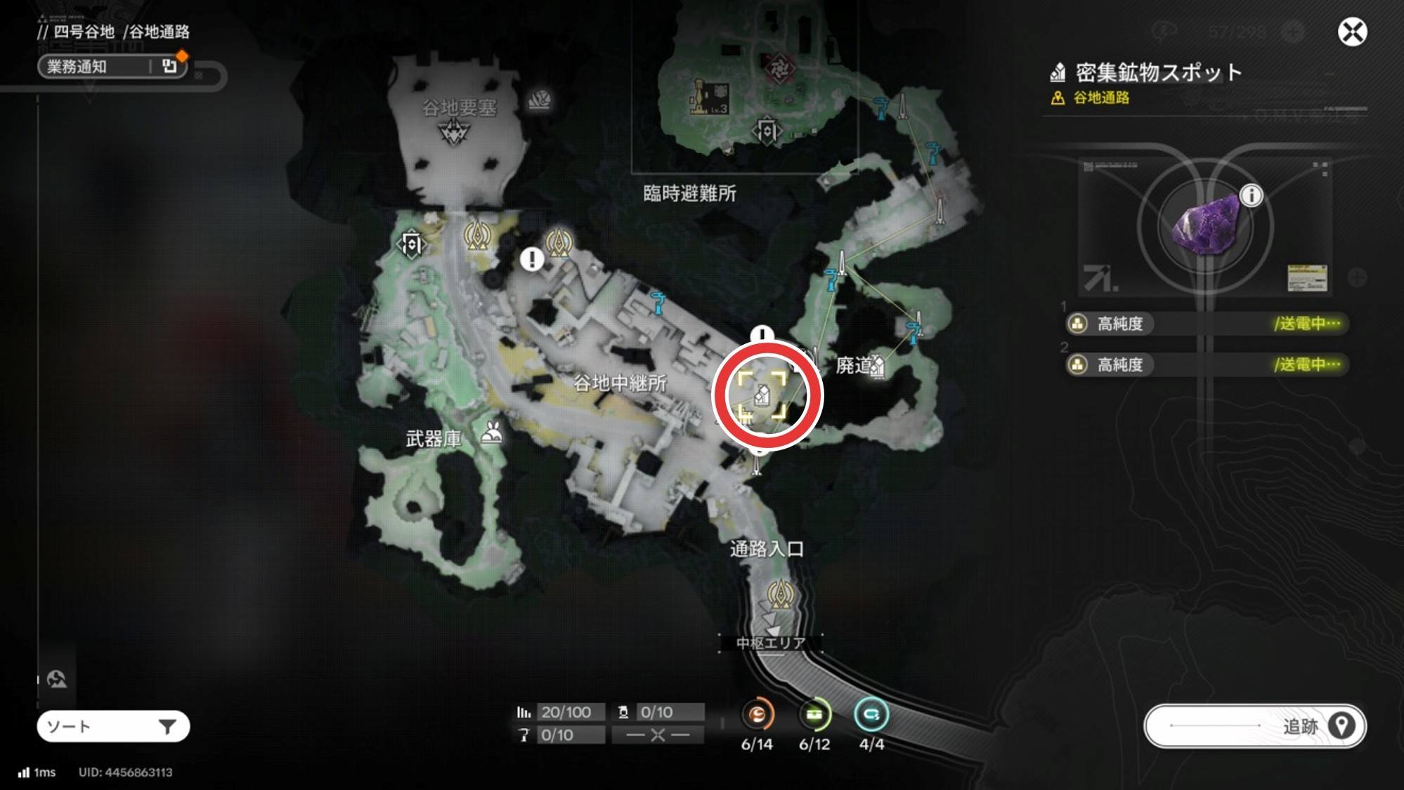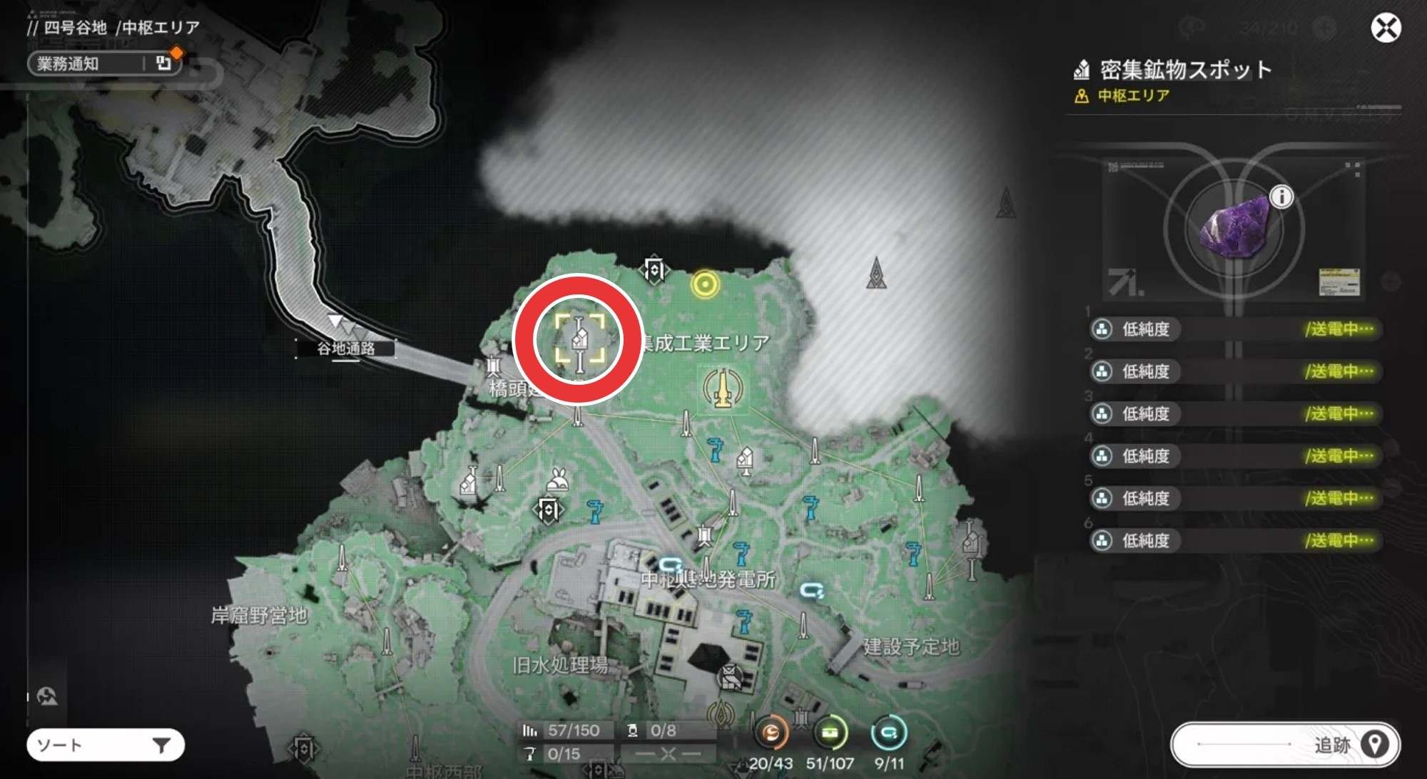 紫晶鉱物の採掘場は、中枢エリアに1箇所、谷地通路に1箇所、アブリ―採石場に2箇所の計4か所です。序盤は不足しがちになるので、最低3箇所以上は採掘機を設置して紫晶鉱物を集めましょう。