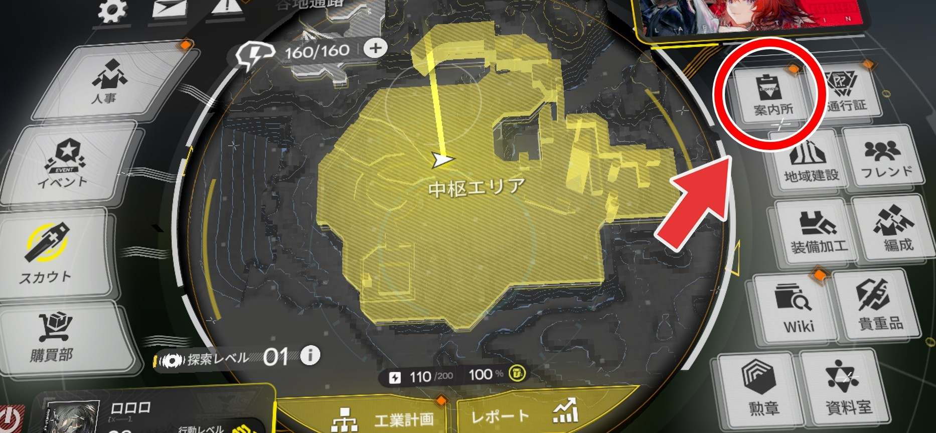フェーズを確認するには、ホーム画面右上のアイコンもしくはホーム画面の「案内所」を選択します。フェーズのほか、デイリーや協約空間、訓練といった各種コンテンツも確認できるため、毎日確認しましょう。