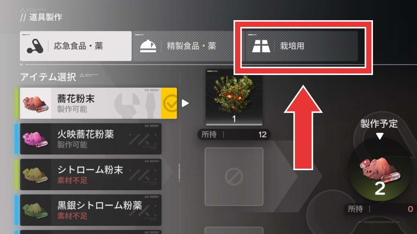 栽培場では、集成工業システムでは作れない植物を育てられます。HP回復アイテムなど、ストーリー進行や高難易度コンテンツで役立つアイテムを作れる便利な機能です。