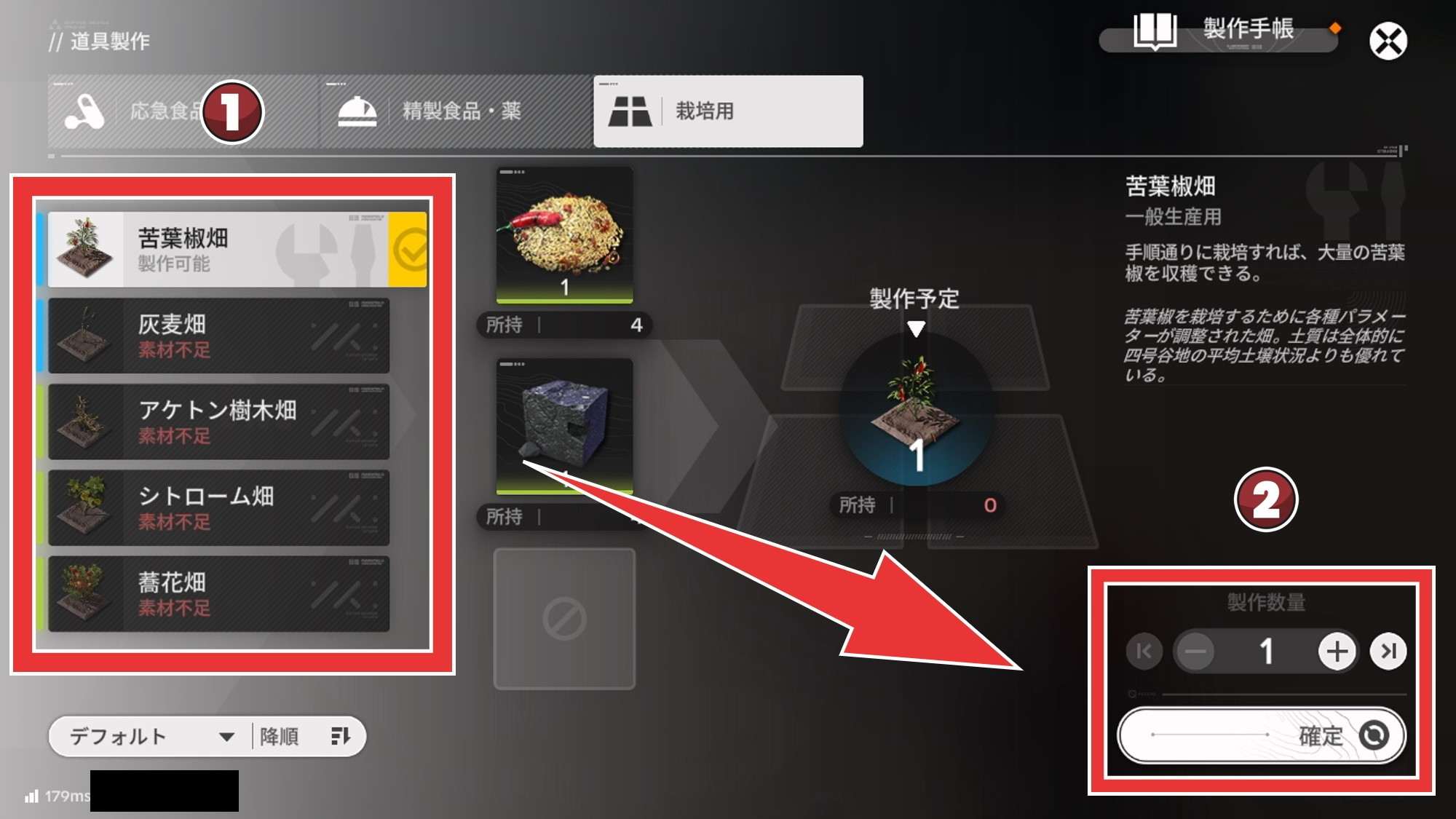 | 4 | 拡大する作りたい畑を選び、作る数を設定して作成 |