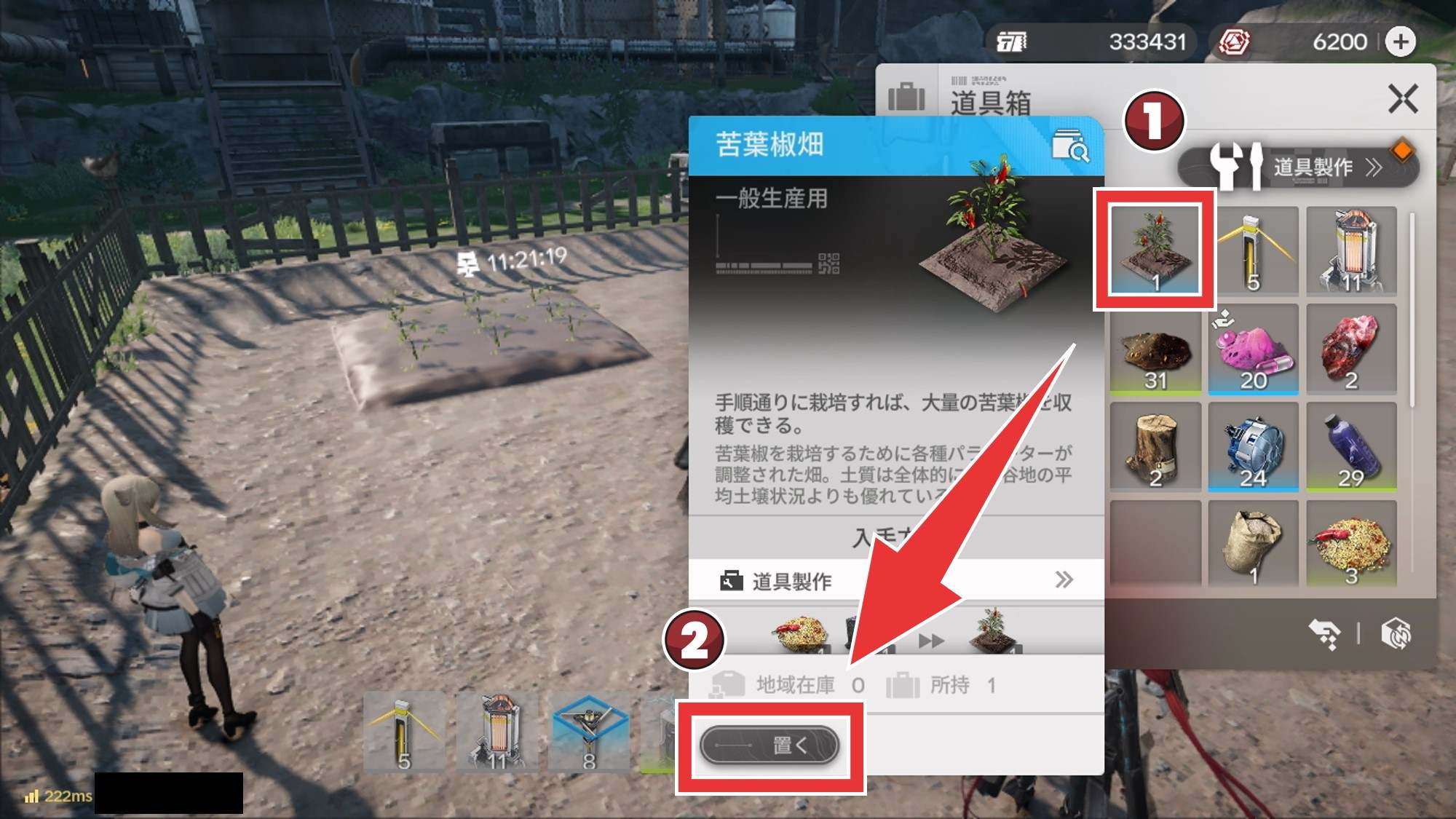 | 5 | 拡大する道具箱で作った畑を選択し、画面下の「置く」を選択 |