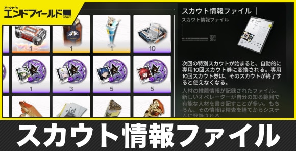 アークナイツエンドフィールドのスカウト情報ファイルの使い方と入手方法をご紹介。スカウト情報ファイルの使用方法とガチャ10回無料券の仕組みについて記載しています。