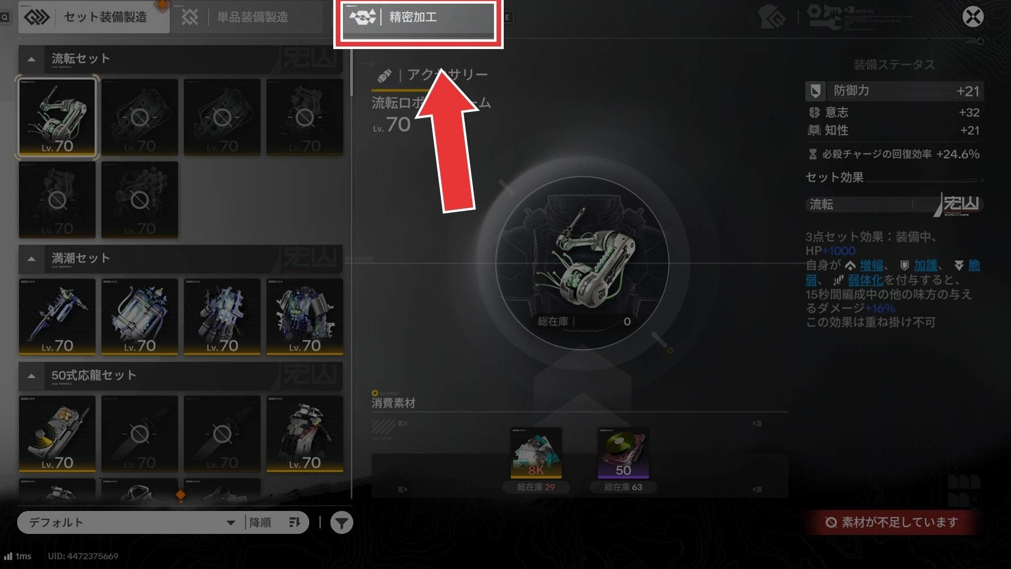 武陵加工強化剤購入と合わせて、精密加工したい装備を量産しましょう。精密加工は確率で成功か失敗か決定するため、大量の装備を消費します。