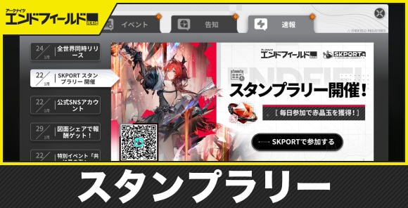 スタンプラリーは、ゲーム内のお知らせか、直接SKPORTスタンプラリーのページにアクセスすることで参加できます。