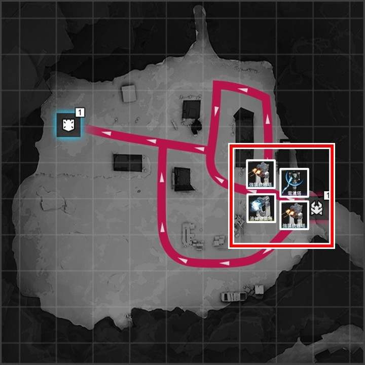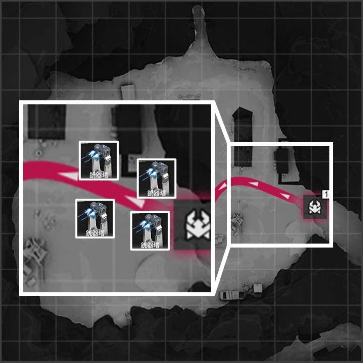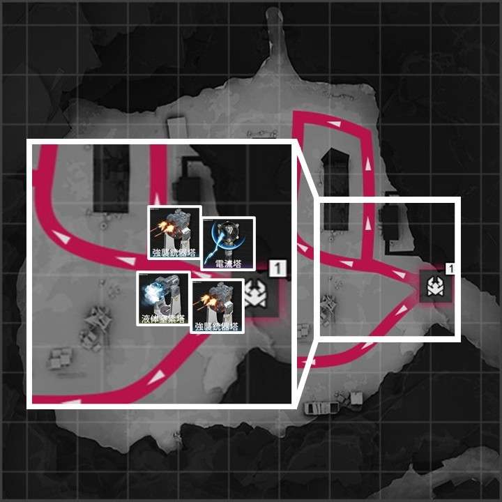 拠点防衛時は、各侵入ルートに減速設備1台と火力設備複数台設置がおすすめです。序盤は「液体窒素塔」で敵を減速させつつ「強襲銃器塔」で敵を倒しましょう。