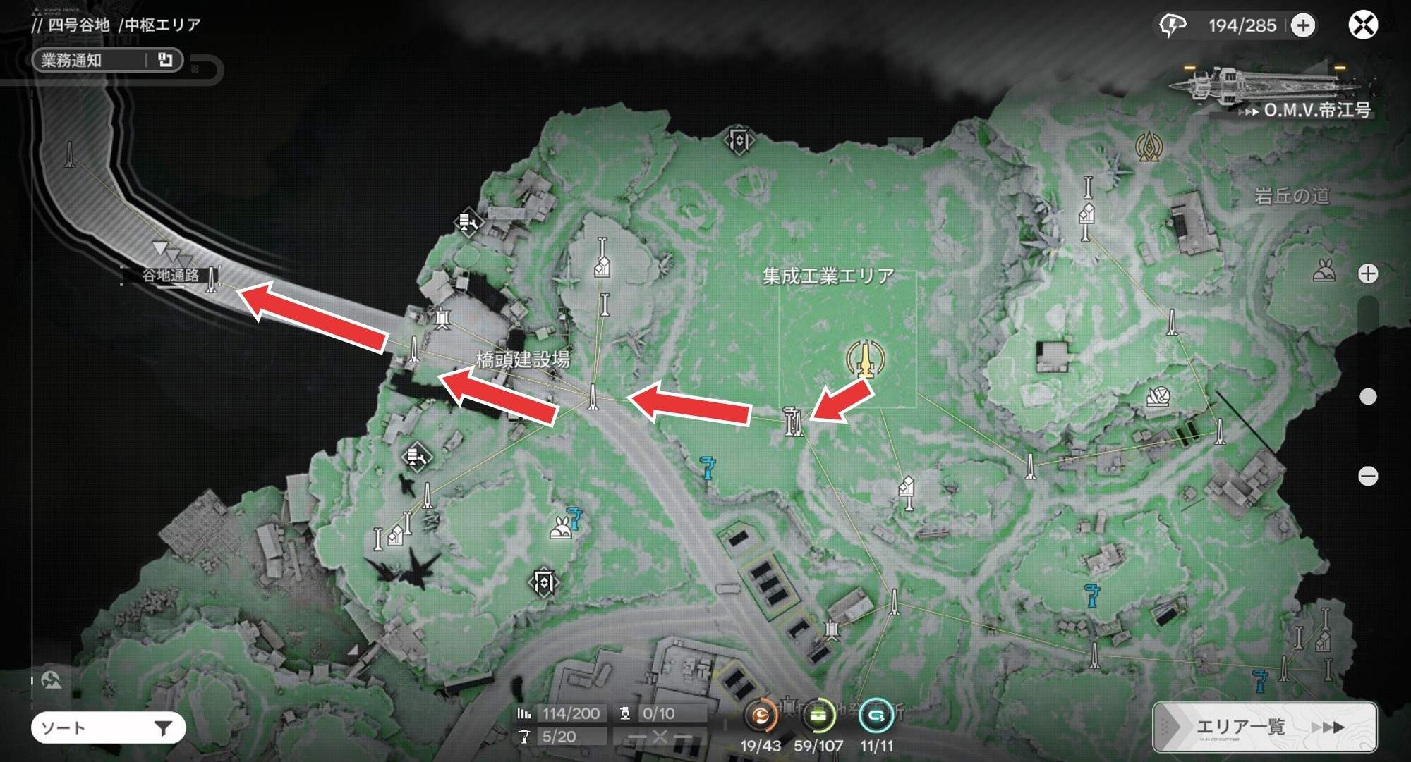 谷地通路への電力は、中枢エリアから電力輸送を行います。ストーリーで集成工業エリアから谷地通路に繋がる橋に電力を通すために電線を伸ばしているので、橋付近の中継タワーから繋げていきましょう。
