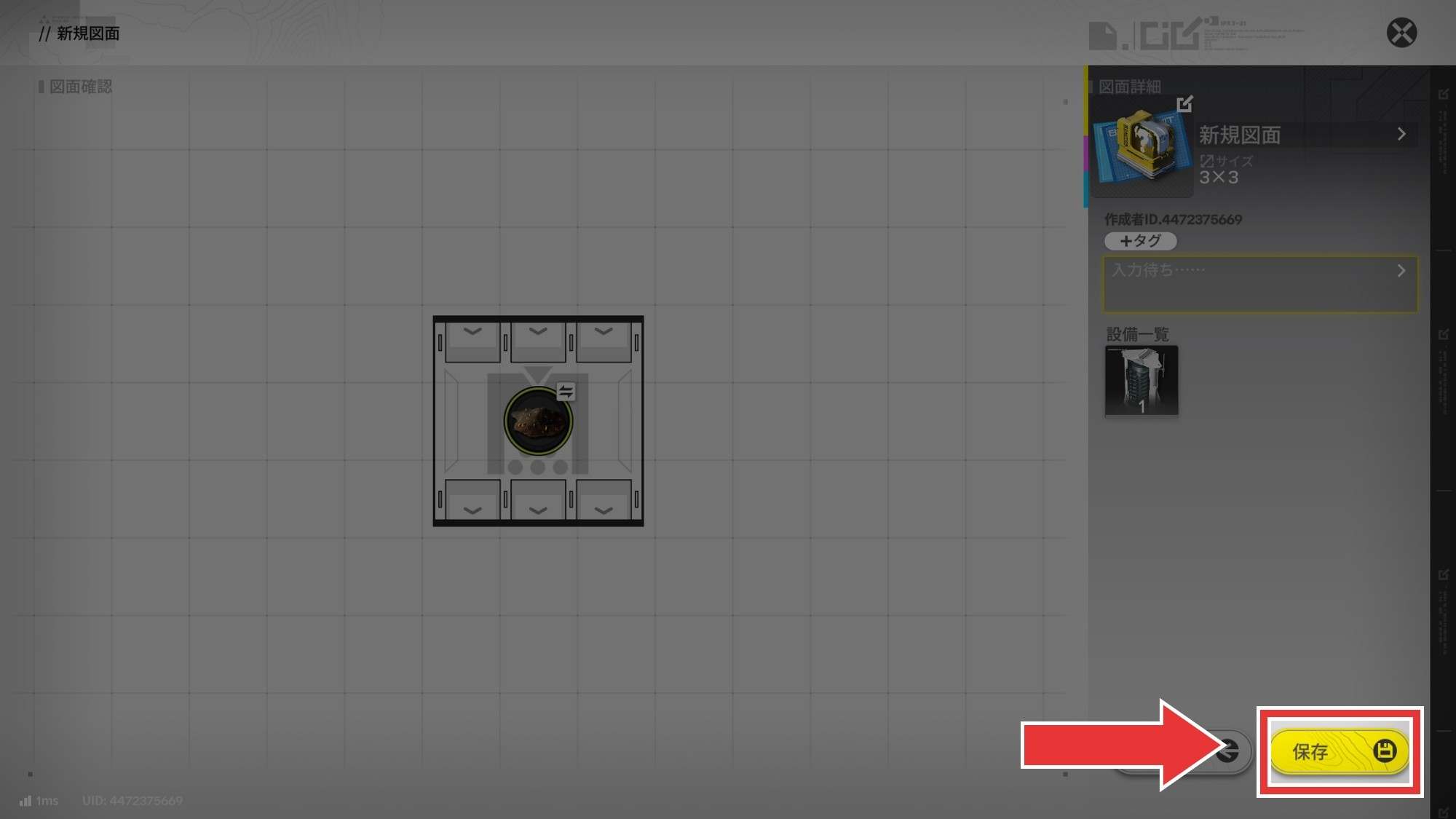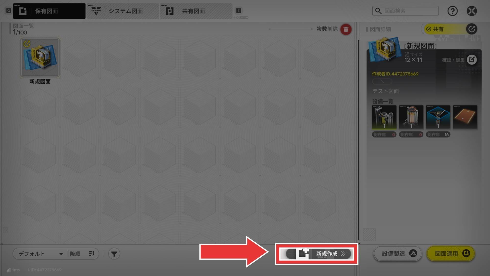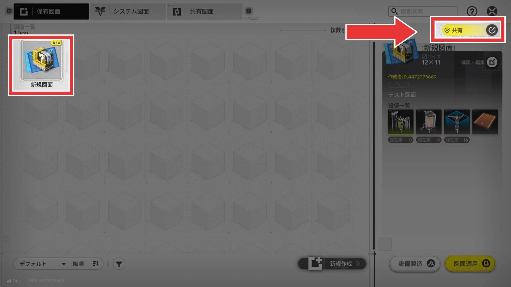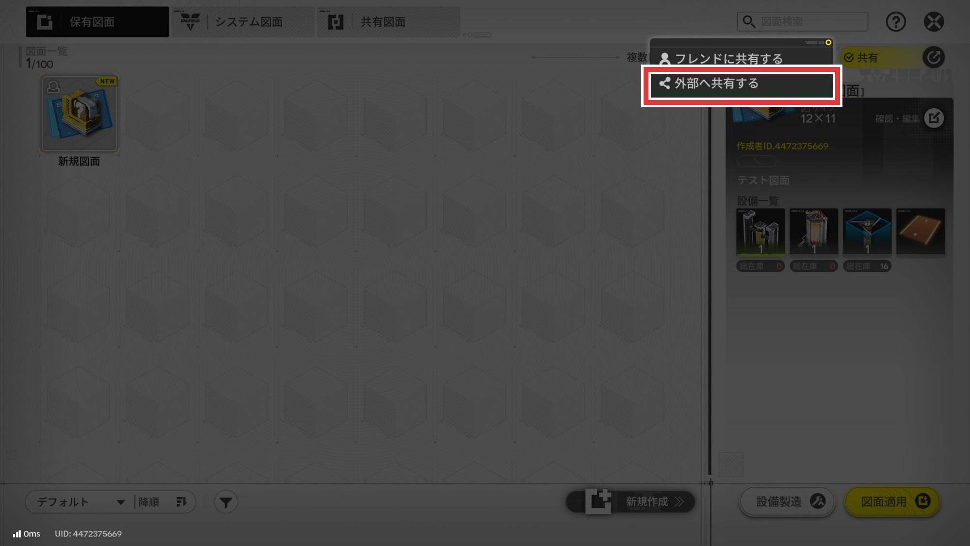 図面の保存は、建設画面の図面メニューから行えます。図面メニュー遷移後、新規作成→登録したい設備を選択して「Ctrl+S」で保存すると図面を保存できるため、共有したい場合は先に図面を保存しましょう。