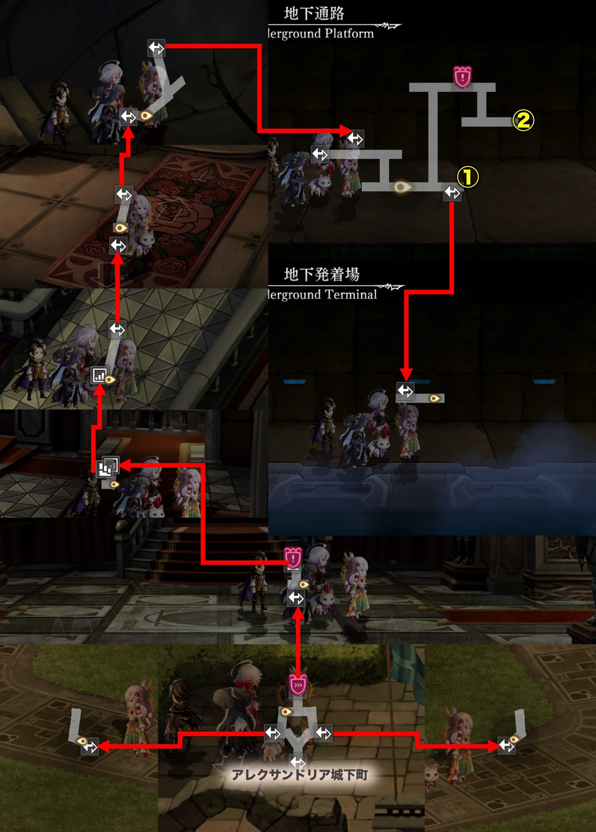 アナデン(アナザーエデン)のアレクサンドリア城のマップを紹介します。宝箱や隠し要素、出現モンスターの弱点や耐性も記載しています。