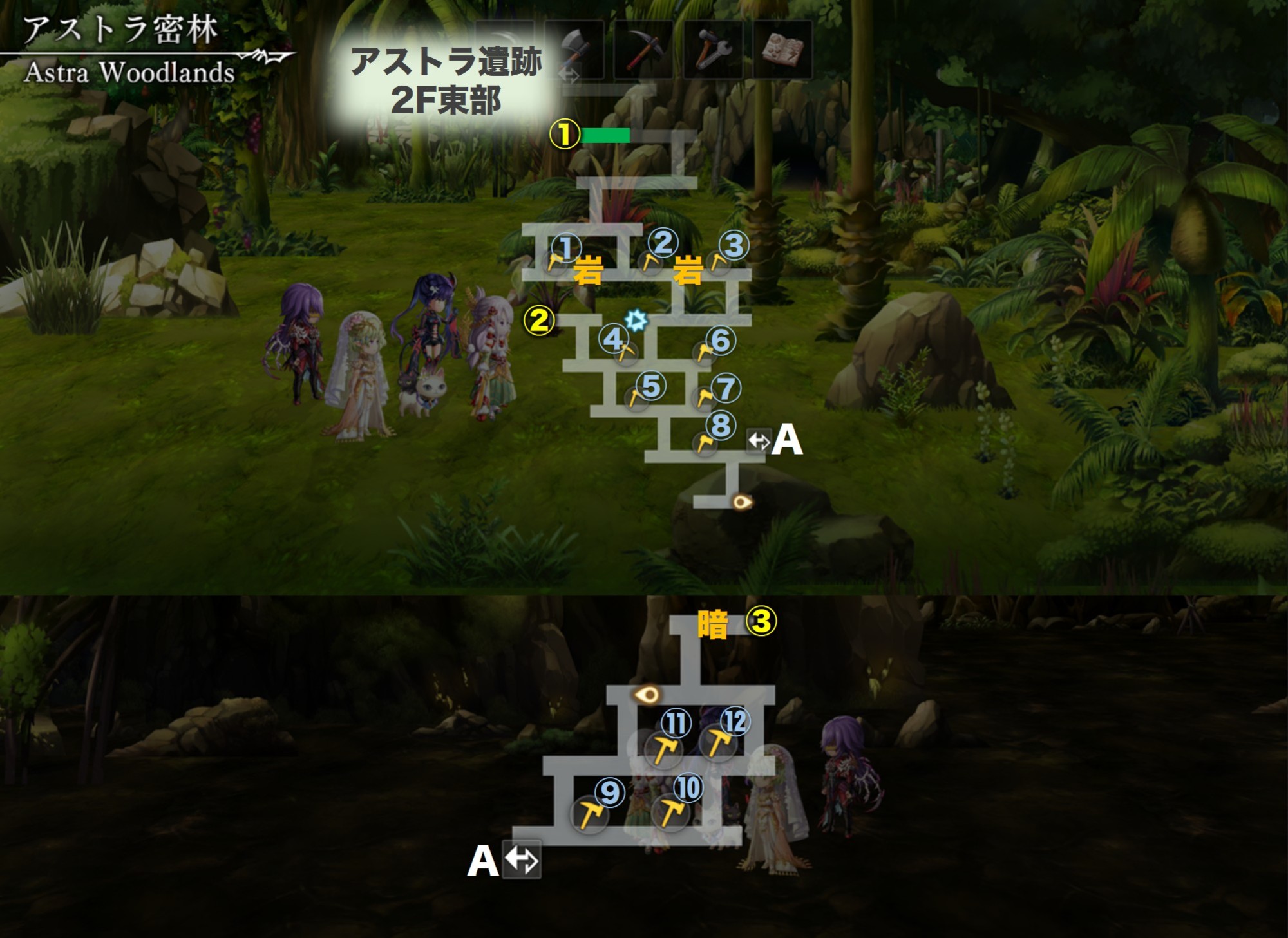アナデン(アナザーエデン)のアストラ遺跡(星見の間・憂苦秘めし園・アストラ密林)のマップを紹介します。宝箱や出現モンスターの弱点耐性についても記載しています。