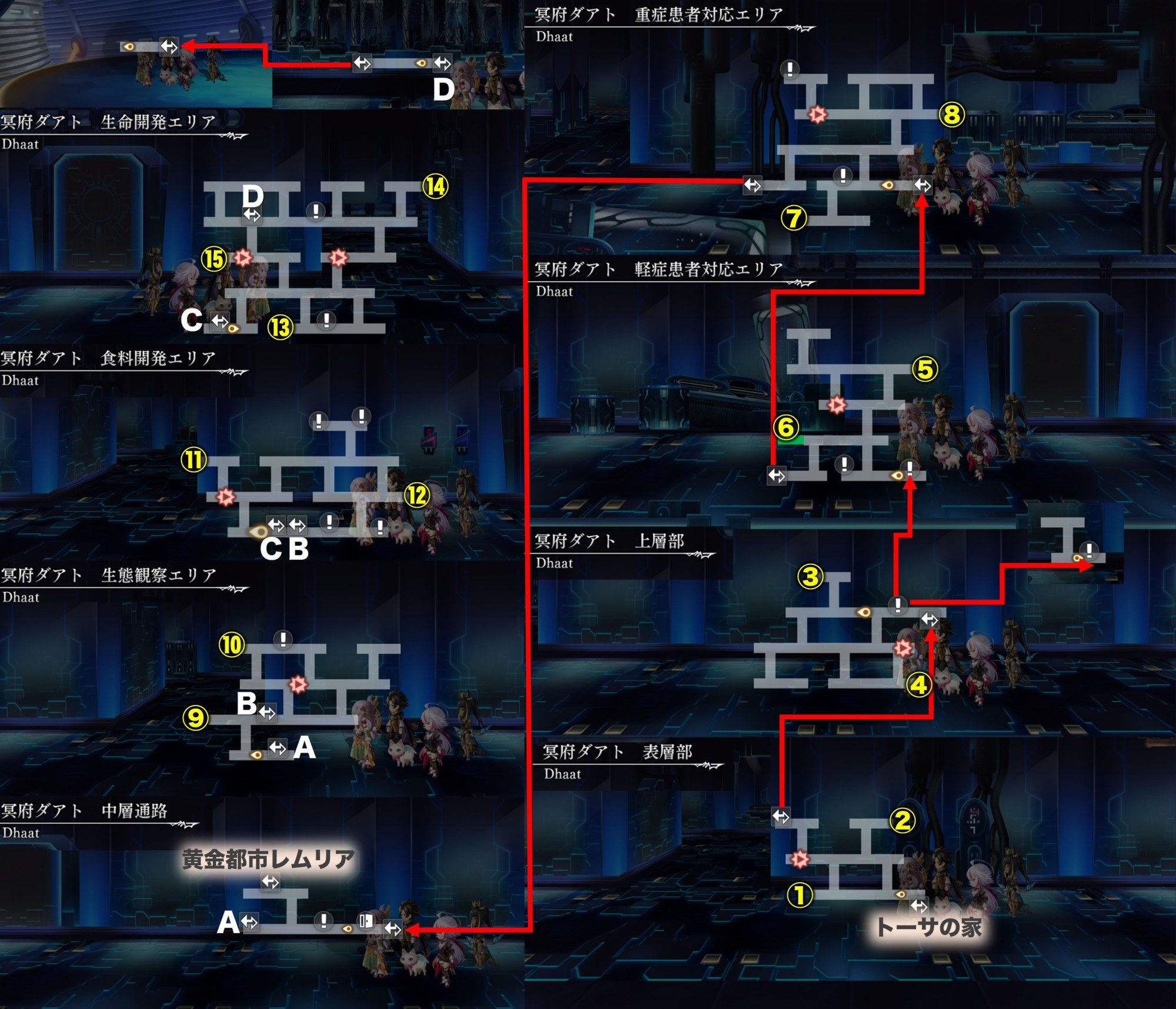 アナデン(アナザーエデン)の冥府ダアトのマップを紹介します。宝箱や出現モンスターの弱点耐性についても記載しています。