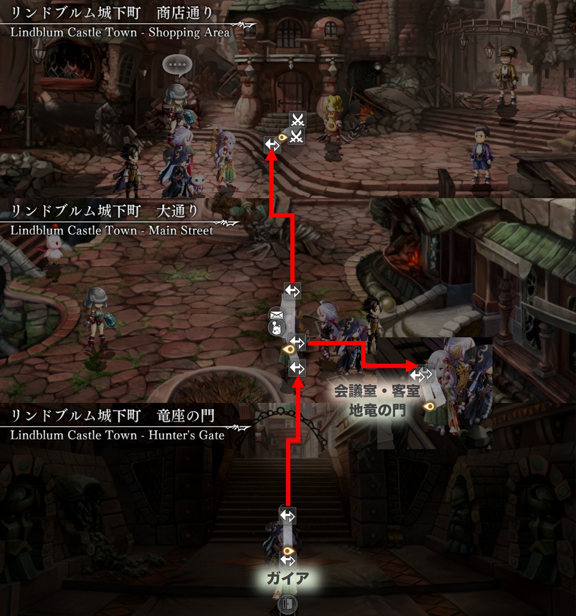 アナデン(アナザーエデン)のリンドブルム城下町のマップを紹介します。宝箱や隠し要素、出現モンスターの弱点や耐性も記載しています。