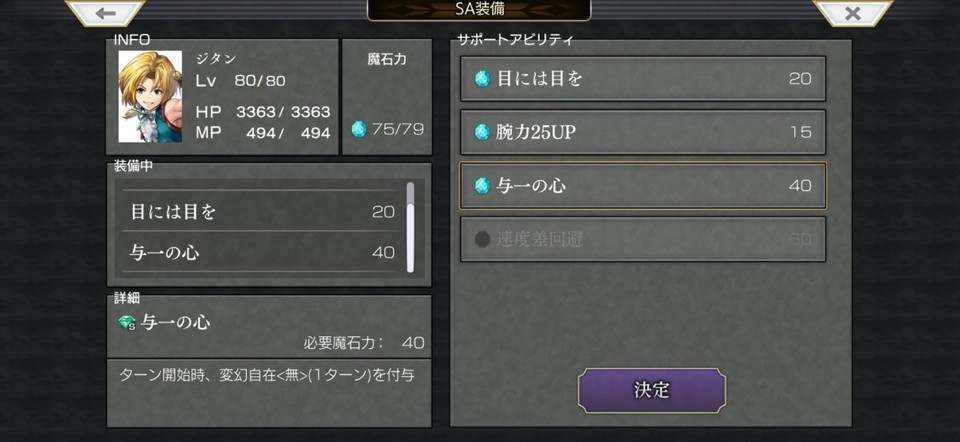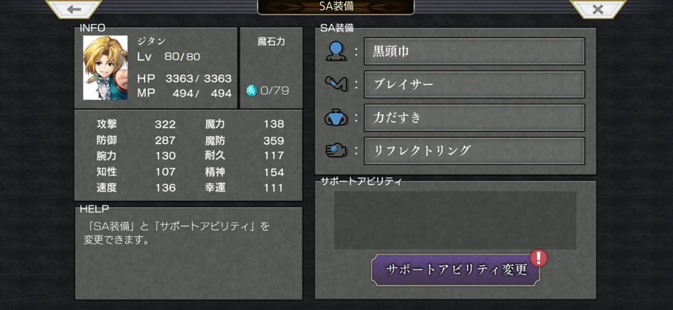 SA装備は、頭・胴・手首・指の4部位に装着できるFF9のコラボキャラ専用の装備です。装備には、ステータス上昇効果と、選択してセットできるサポートアビリティが付いています。