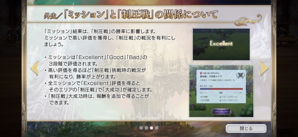 ミッションは、様々な内容が用意されており、指示に従ってクリアすると3段階の評価を得られます。高い評価は、後の「制圧戦」の勝敗に影響するのので重要です。