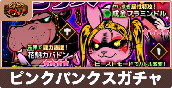 どうぶつマフィアのピンクパンクスガチャは引くべきかをご紹介。ガチャのおすすめ理由やPUのウサギース(兎)、フラミンゴル(フラミンゴ)、カバどん(河馬)の性能についても記載しています。
