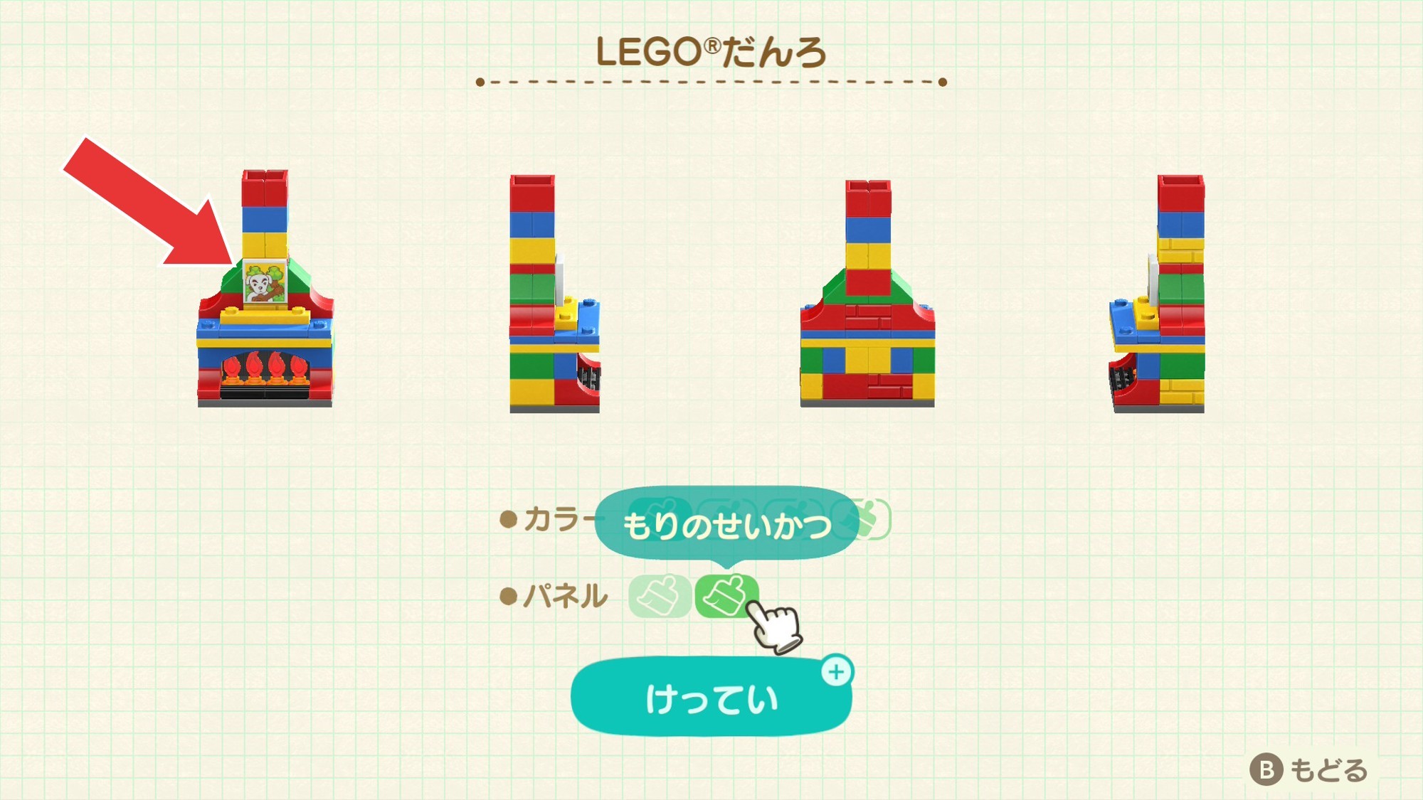 LEGOだんろはカラバリに加えて、パネルも変更可能です。LEGOのパネルと、とたたけの曲で有名な「もりのせいかつ」から選べます。