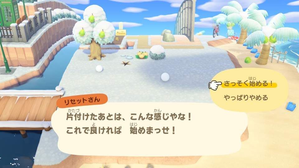 リセット片付けセンターは、Ver.3.0アップデート後、島の外を歩いているリセットさんに話しかけると解放されます。攻略班では、アプデから4日後に会えたため、リセットさんがいない時は、翌日以降に探しましょう。