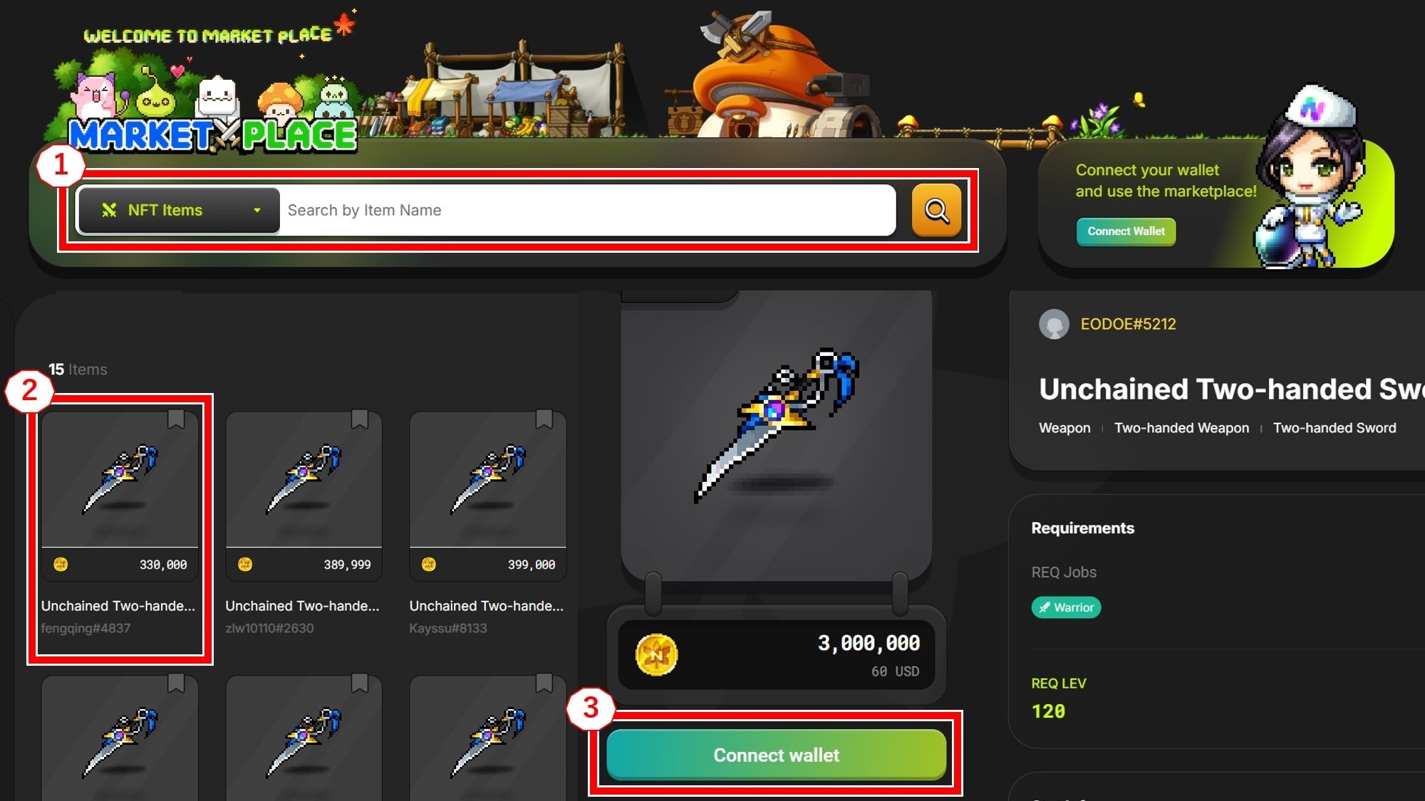 メイプルストーリーNのNFTは、MSUマーケットプレイス(ゲーム内マケプレ)で購入できます。MSUマケプレでは、キャラや装備、アイテムをゲーム内通貨NESOを資金に取引できます。