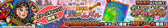 ダメージチャレンジイベント「聖梵ムガル」が開催中です。敵に与えたダメージが多いほど報酬が増加するイベントで、獲得ポイントが400万を超えるとURシール「聖梵ムガル」を入手できます。