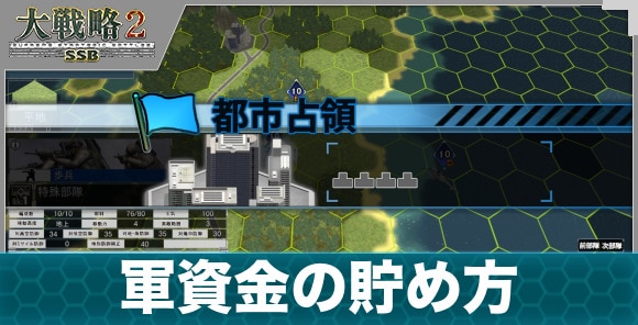 大戦略SSB2の軍資金の貯め方と使い道を紹介しています。軍資金が貯まるタイミングや都市占領のメリット、部隊の生産について記載しています。