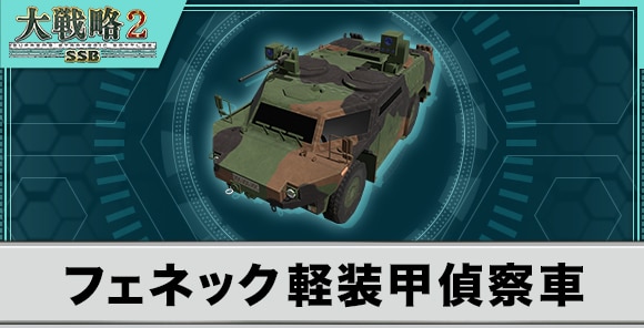 大戦略SSB2のフェネック軽装甲偵察車の性能と武装を紹介しています。フェネック軽装甲偵察車の移動力や兵器性能、特殊能力についても記載しています。
