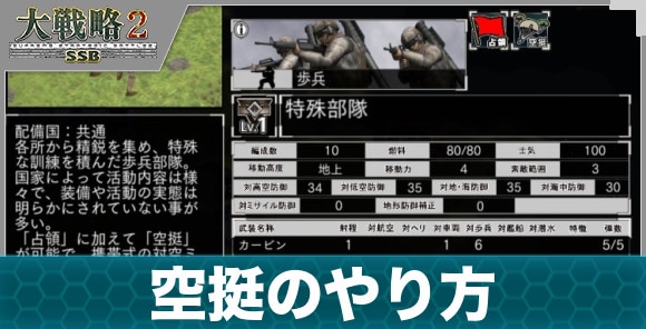 大戦略SSB2の空挺(くうてい)のやり方とメリットを紹介しています。空挺ができる兵器や空挺に関する内容を記載しています。