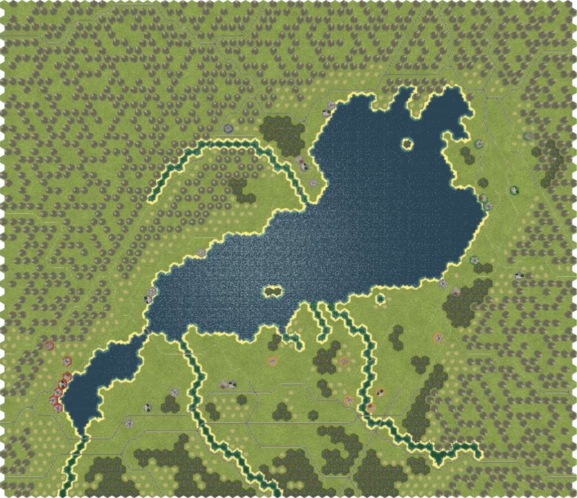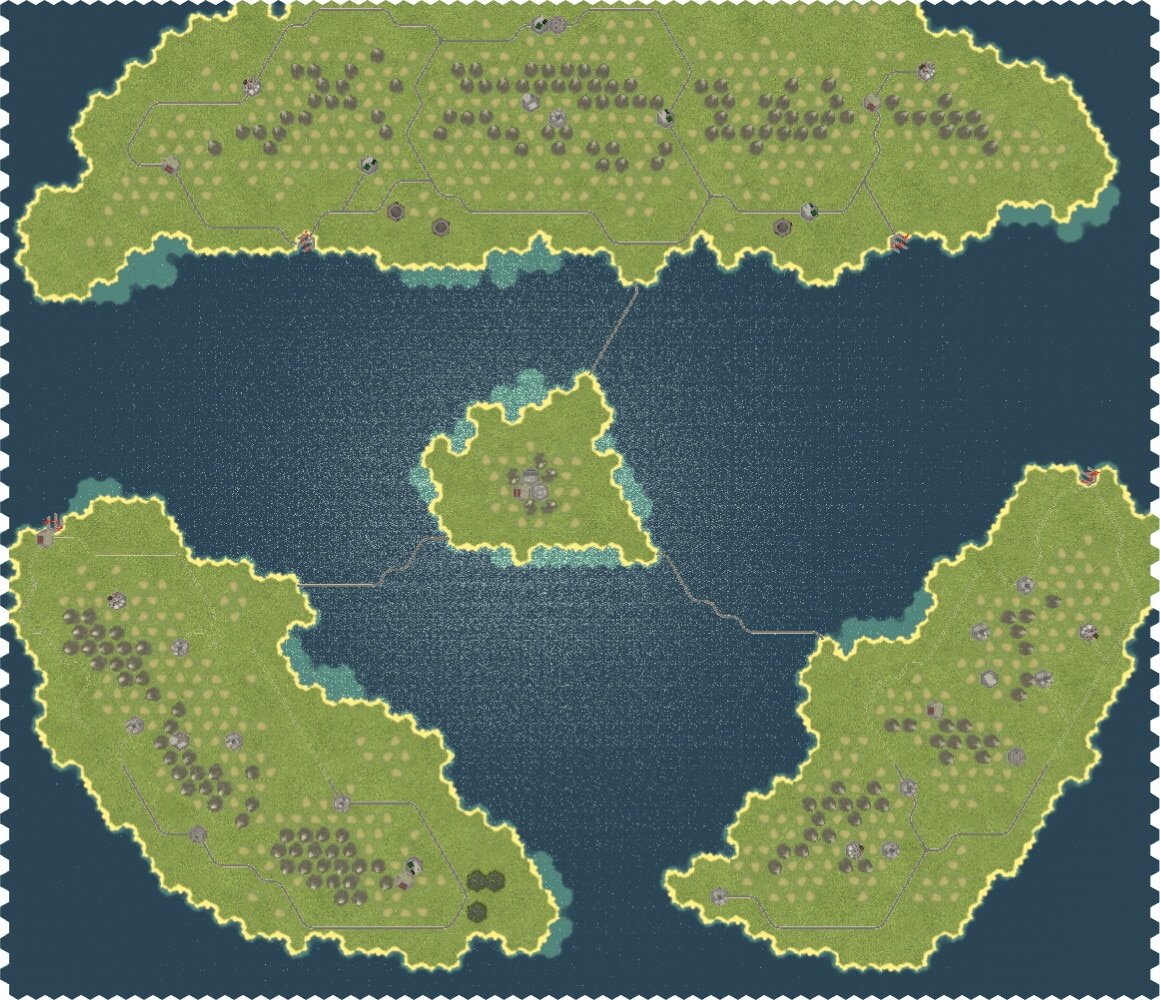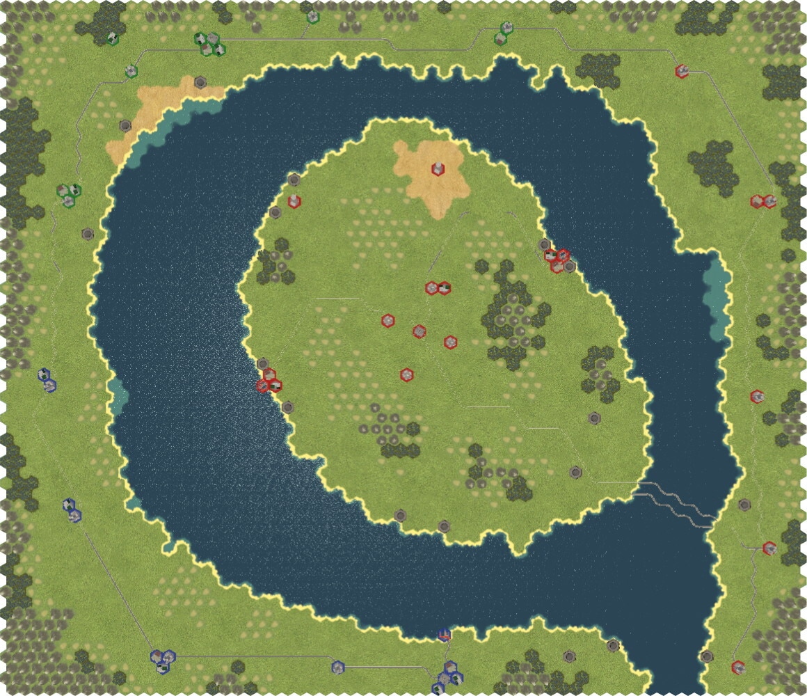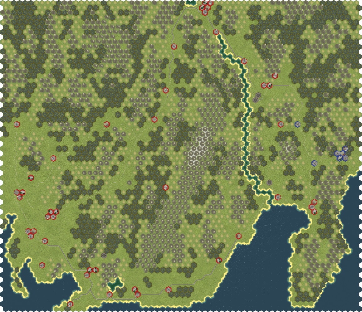 大戦略では、定番中の定番マップ。ああ、懐かしき故郷。全ての戦いは、ここからはじまった。見慣れたマップに新たな戦略!目指せ、ダイセンリャカー! |