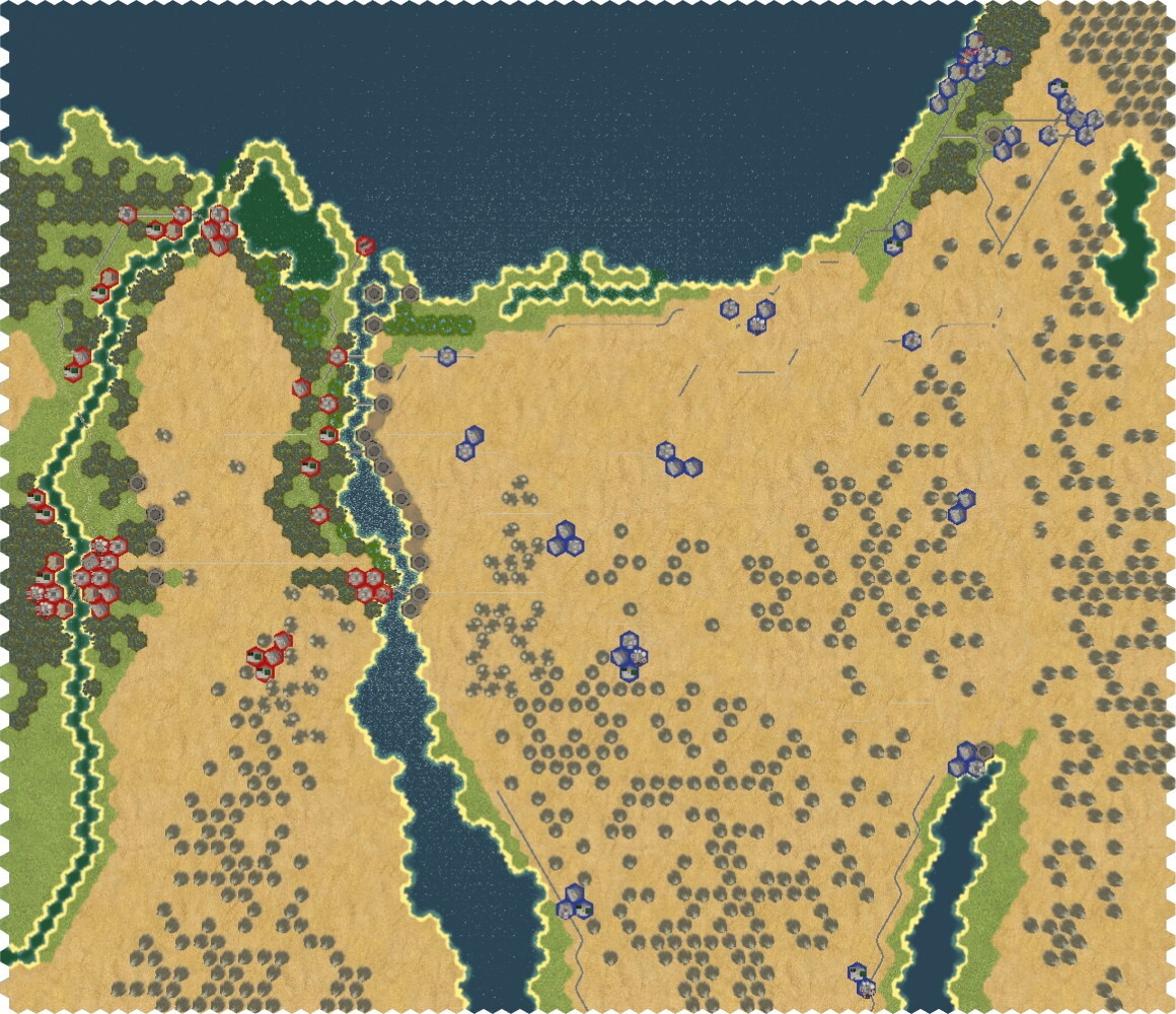 砂漠の3勢力戦です。視界が狭く資源も乏しい状況を如何に有利に進めるか、指揮官の技量が問われます。 |