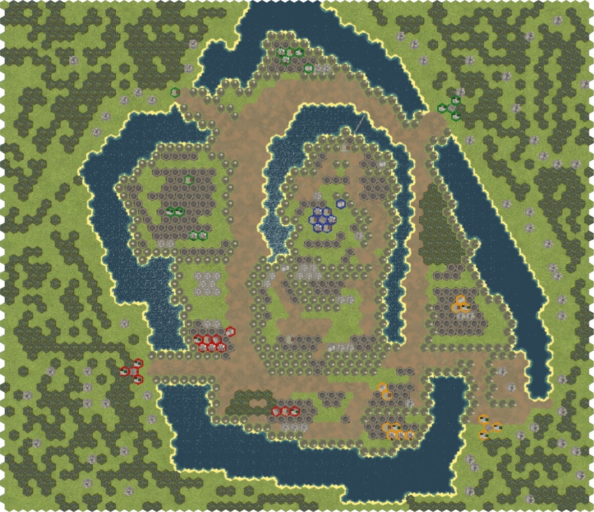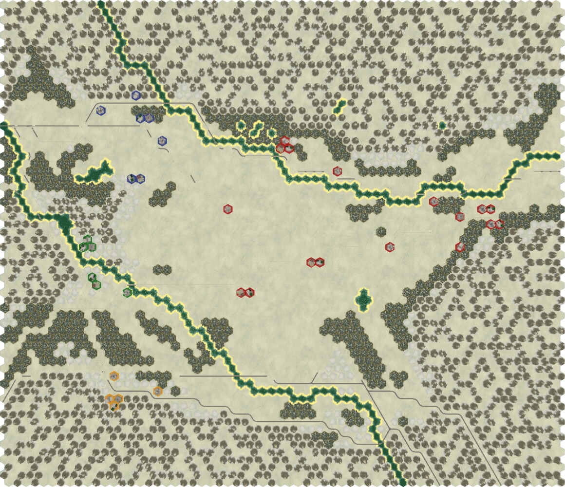天下分け目の戦いです。BLUE、GREEN、YELLOW連合軍でRED軍を包囲、殲滅しましょう! |