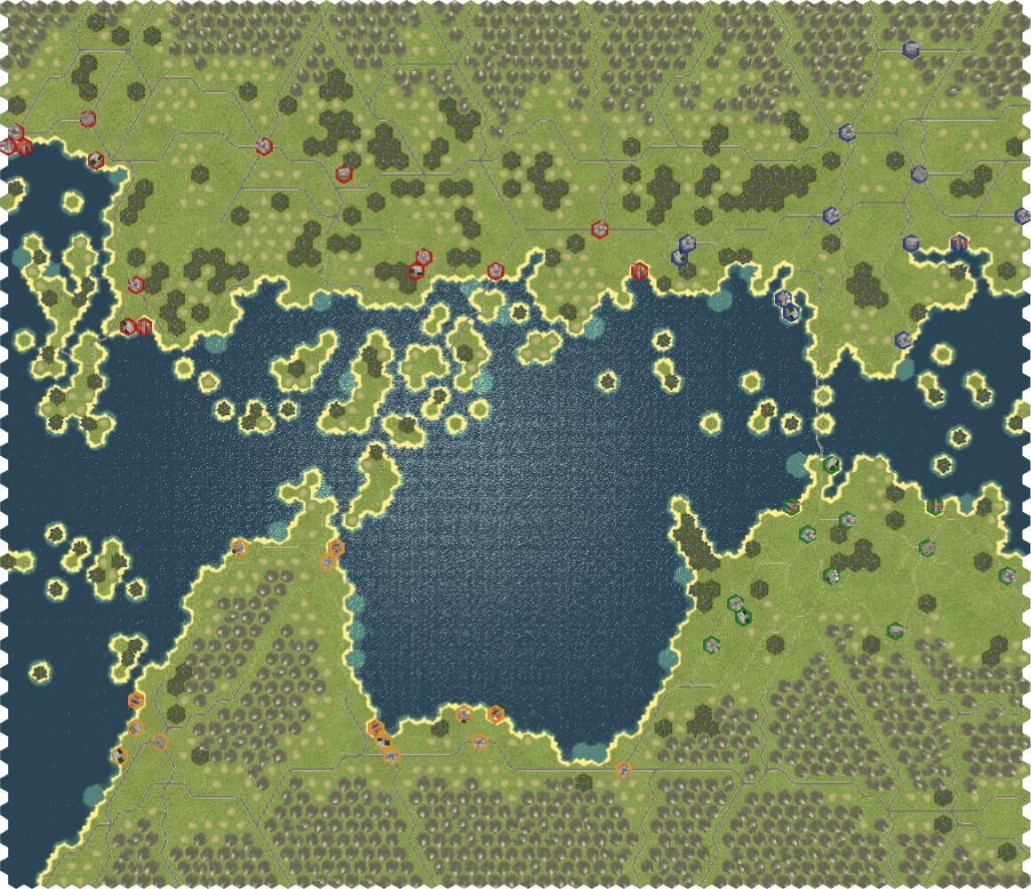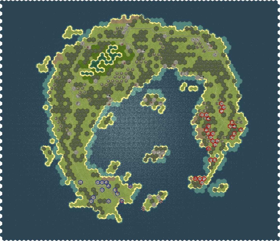 湖は凍結し、艦船は使用できません。相手2勢力は同盟を組んでいます。慎重に、時に大胆に前線を進めましょう。 |