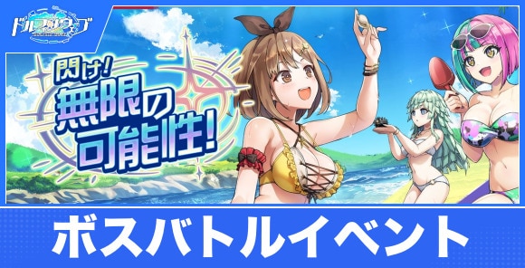 ドルフィンウェーブ(ドルウェブ)のライザのアトリエとのボスバトルイベント「閃け!無限の可能性!」の攻略情報を紹介。難易度EXTREMEの攻略方法や攻略おすすめキャラ、イベントの効率的な進め方や報酬の交換優先度についても記載しています。