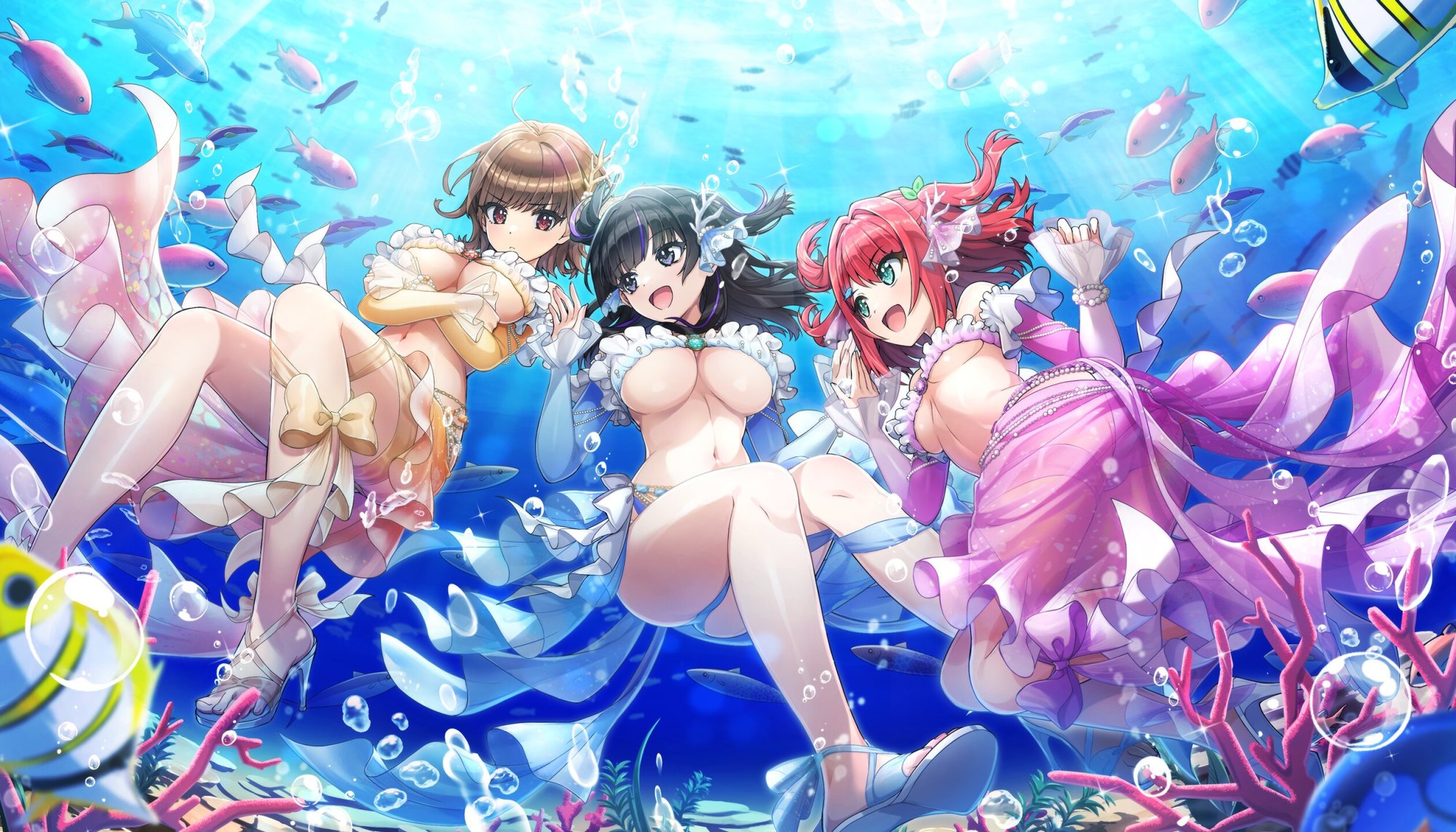 | 「撮影の準備、出来たみたいですよ!」「はぁ……わざわざこんな格好するために 出掛けたわけじゃないんだけど」 「スマイルだよ、つぐぴ~! こはぴも付き合ってくれるみたいだし!」 Salacia主催のマーメイドカフェは大好評。 衣装を着てみたいとの声も大きかったようで 衣装を試着しながらマーメイド風の撮影が出来る 特設ブースを急遽開くことにしたらしい。 何も知らずにビーチを訪れたつぐみたち3人は ヴィーナに見つかり撮影に巻き込まれたようだ。 |