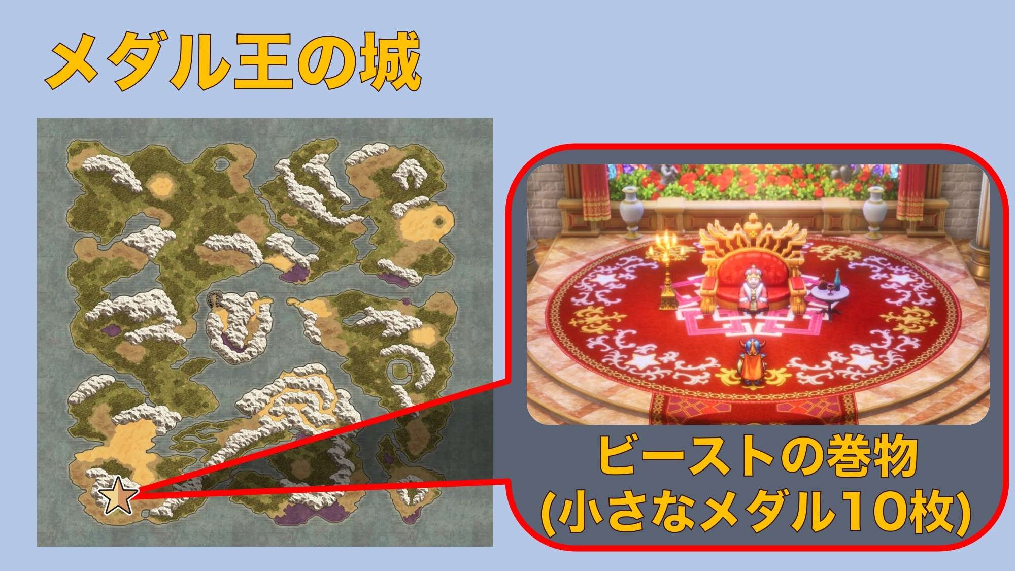 ビーストの巻物は、メダル王の城でちいさなメダルの10枚目報酬で入手できます。ビーストモードは、数ターンの間2回行動ができるようになる最強格の補助特技です。終盤のボス戦まで活躍するので、ちいさなメダルが集まり次第取りに行きましょう。