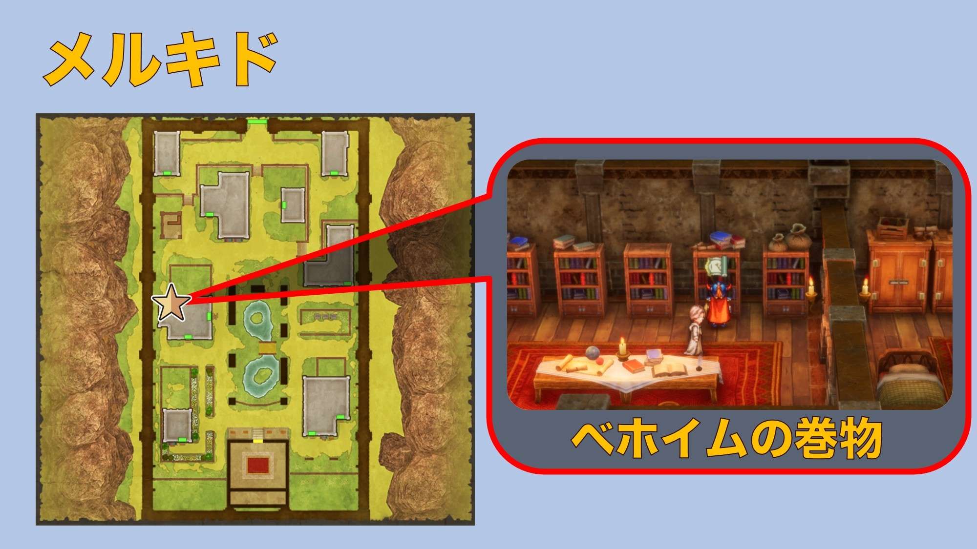 ベホイムの巻物は、メルキドで入手できます。ベホイムは、ドラクエ1で最もHPを回復できる呪文です。ストーリー終盤は受けるダメージ量も増えるので、習得しておきましょう。