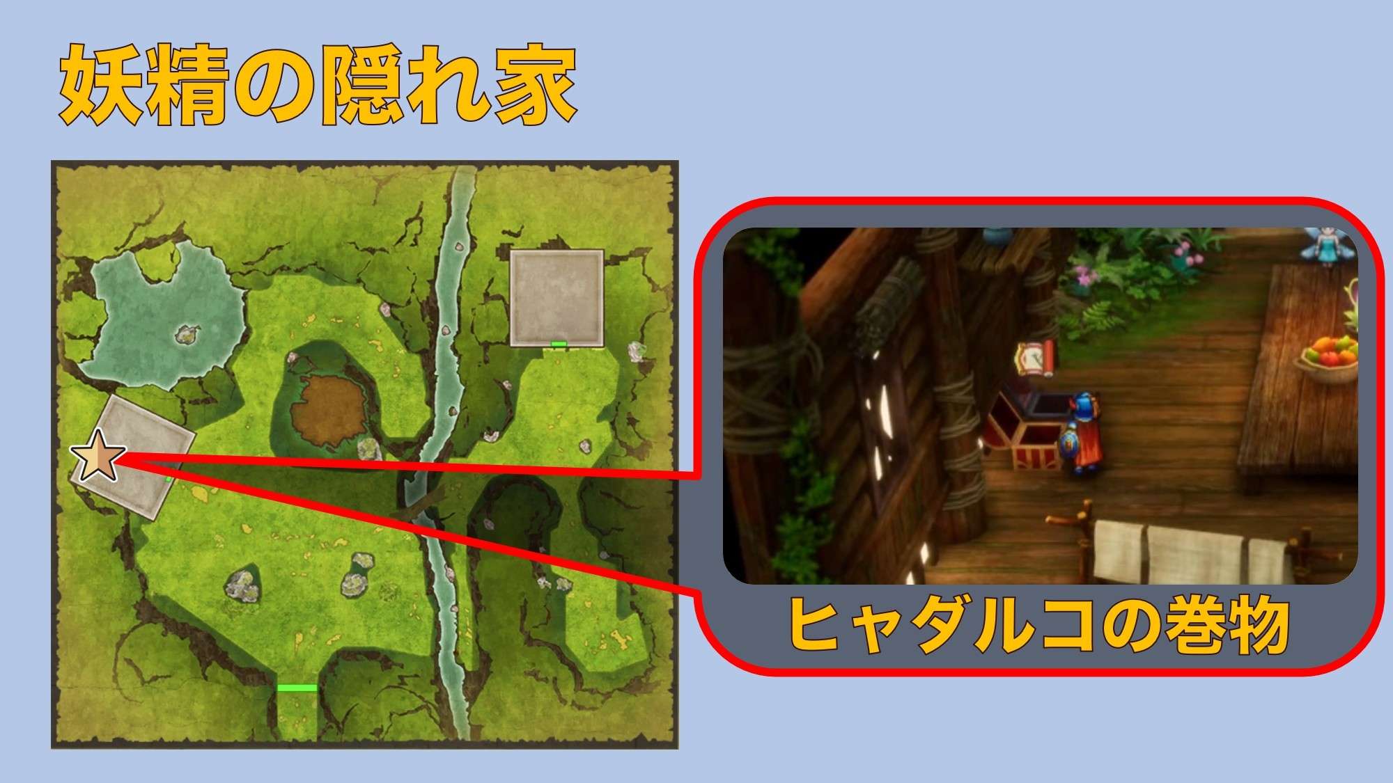 ヒャダルコの巻物は、妖精の隠れ家で入手できます。ヒャダルコは、序盤に習得できる貴重なグループ攻撃呪文です。特に、序盤の強敵であるカンダタ戦で子分2体をまとめて倒す時に大活躍します。カンダタ戦前に寄り道して習得しておきましょう。