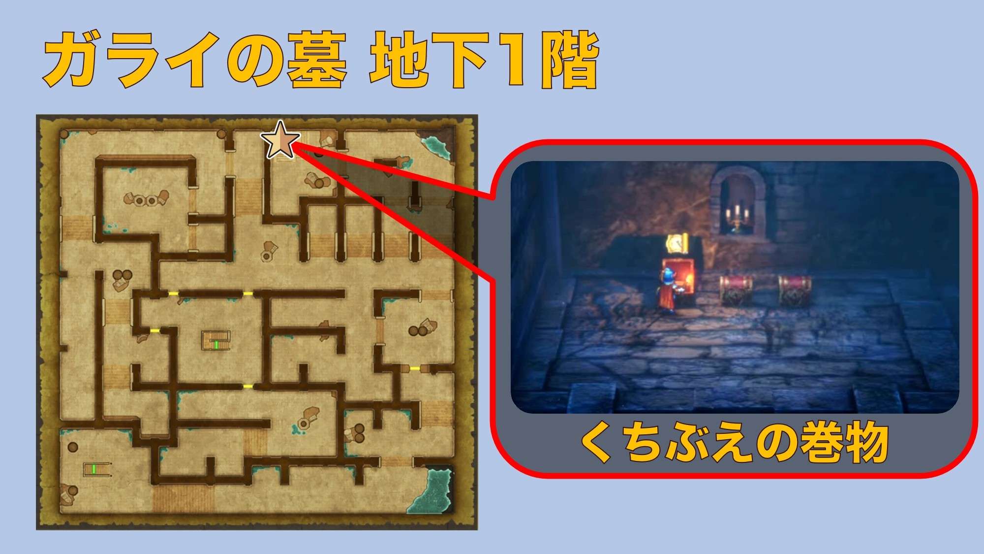 くちぶえの巻物は、ガライの墓で入手できます。くちぶえは、使用するとすぐに敵との戦闘が始められる特技です。レベル上げと金策で敵を倒しまくりたい時に効率をアップできます。