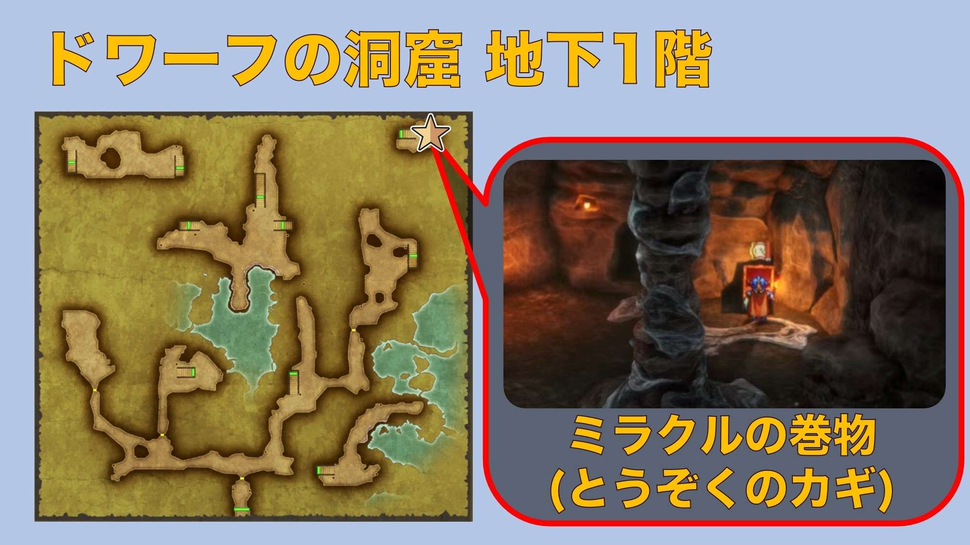 ミラクルの巻物は、ドワーフの洞窟で入手できます。ミラクルソードは、攻撃をしながら回復ができる非常に優秀な特技です。1人旅のドラクエ1において、攻守を両立できる特技は習得して損はありません。